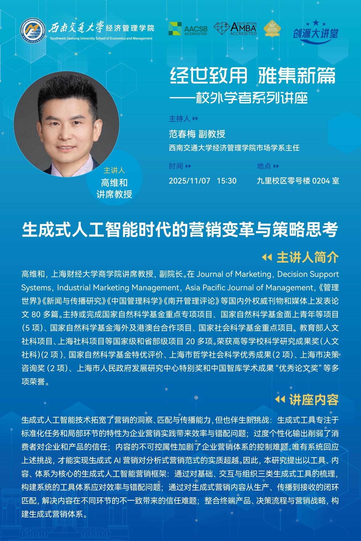 Speaker ProfileDr. GAO Weihe is a Chaired Professor and the Associate Dean of the College of Business at Shanghai University of Finance and Economics. He has published over 80 papers in prominent domestic and international journals and media outlets, including Journal of Marketing, Decision Support Systems, Industrial Marketing Management, Asia Pacific Journal of Management, as well as leading Chinese ...