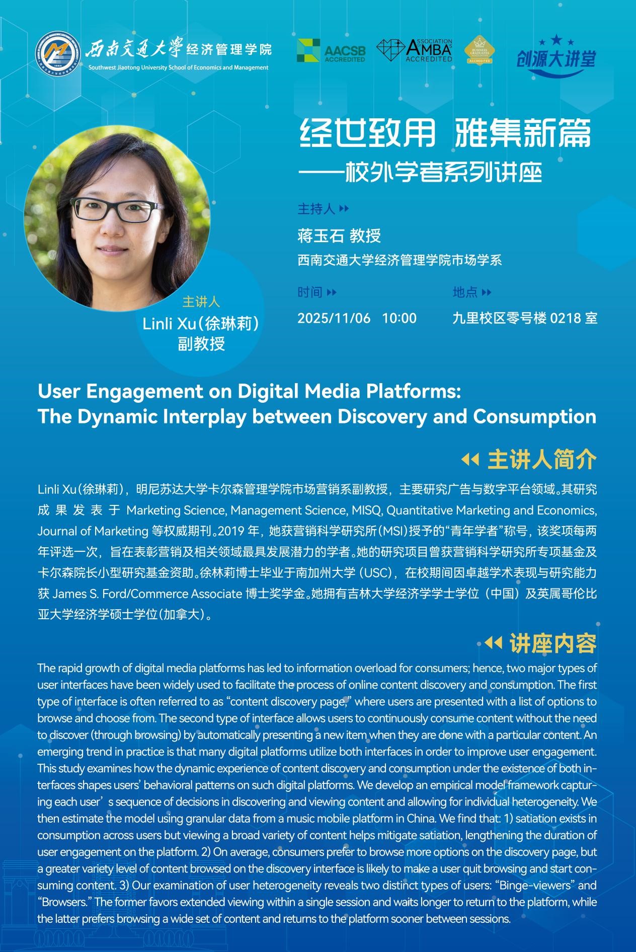 Speaker ProfileDr. XU Linli is an Associate Professor of Marketing at the Carlson School of Management, University of Minnesota. Her research focuses on advertising and digital platforms.Her work has been published in premier journals, including Marketing Science, Management Science, MIS Quarterly, Quantitative Marketing and Economics, and Journal of Marketing. In 2019, she was named an MSI Young Scholar ...