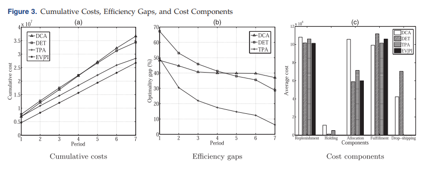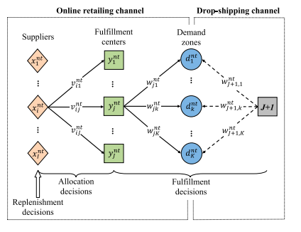 This paper studies the collaborative optimization of multi-period inventory replenishment, allocation, and order fulfillment of online retailers under conditions of uncertain demand. Considering the fixed replenishment cost and unknown demand distribution, it innovatively proposes two stages based on robust optimization Solving algorithm. The first stage uses a goal-oriented robust optimization method to solve the optimal static binary replenishment variables, and the second stage uses linear criteria to dynamically adaptively make decisions about replenishment, allocation and performance, thereby avoiding the computational complexity of adaptive binary variables . A large number of numerical experiments show that the algorithm is superior to the existing multi-stage mixed integer robust optimization methods in the literature in terms of solution quality and calculation time, and it can obtain near-optimal solutions faster for large-scale problems. A case study was carried out using actual operating data of a fashion online retailer in Singapore, and the results showed that the implementation of this algorithm can effectively reduce the company's operating costs by about 30% under the existing strategy.