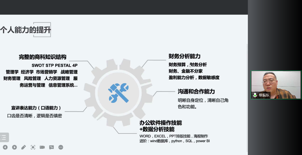 接着,蔡振东为同学们细致地讲解了商赛的类别,并提出参加市场营销类、创新创业类、案例分析类、高顿名企挑战赛等商赛对个人能力的要求以及能获得的相关技能。随后,他具体分析了商赛的比赛流程,并根据自身经验对商赛的各个环节提出了宝贵建议。