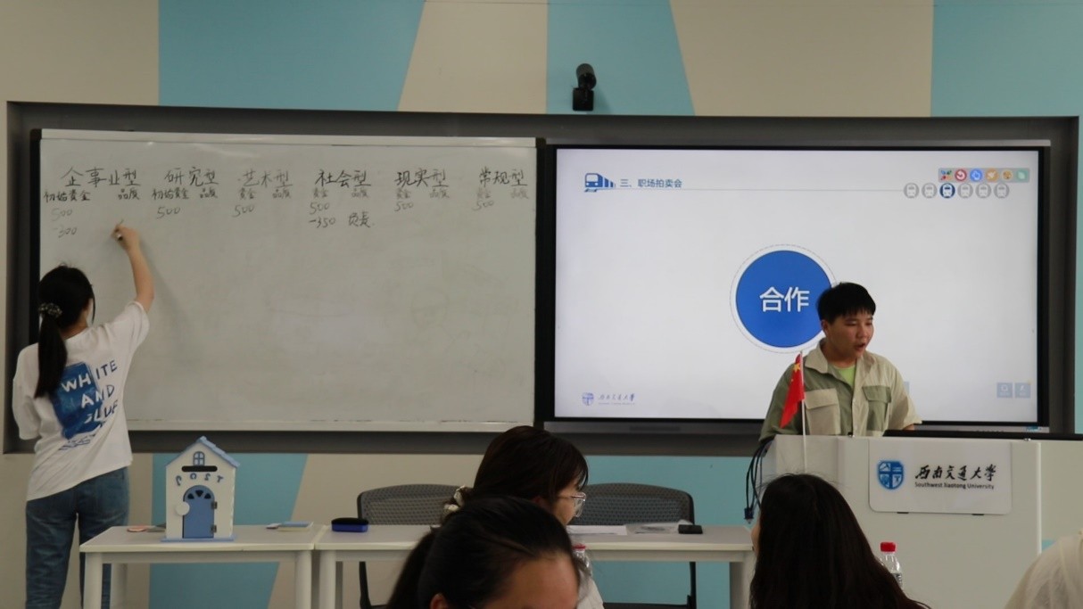 紧接着,班长邀请了莫代玉和同学们同玩热身小游戏。大家限时接力用画画的方式描绘主持人给出的职业。通过这个小游戏同学们看到了大家对于同一职业的不同理解,既活跃了现场气氛,也很好地呼应了生涯规划的主题。