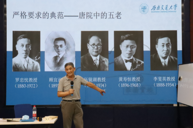 接着,梁锦唐又讲述了我校优良校风的形成和我校精神“竢实扬华,自强不息”的由来。无论是以唐院五老为代表的老师们严谨治学、严格要求的传统,还是在支援抗美援朝时学生们展现的爱国、爱校、敬业、奉献的品质,或是历届优秀校友在自己岗位上艰苦奋斗、开拓创新的精神,都让同学们为之自豪,为之鼓舞。