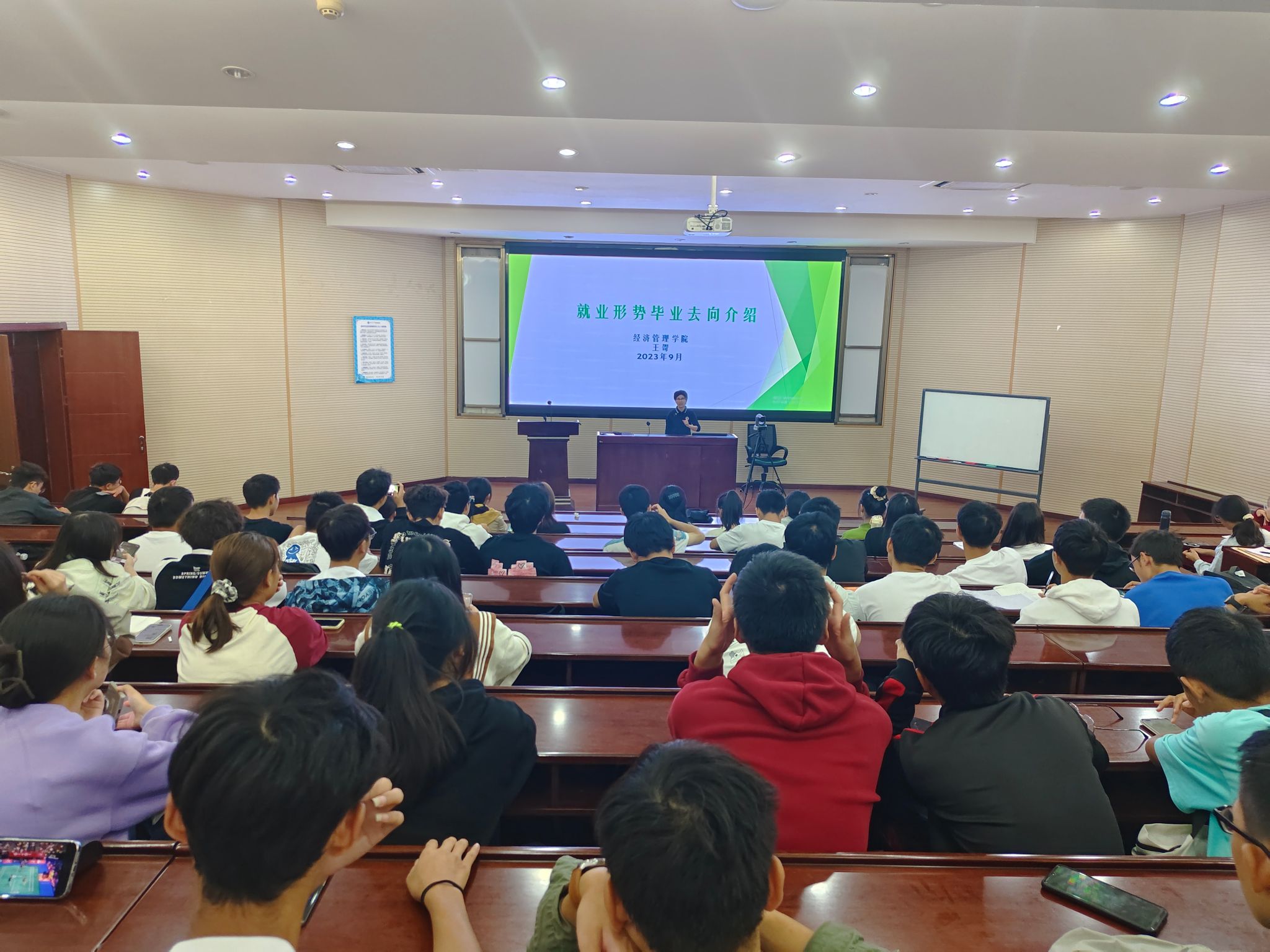 本科2023级经济贸易类专业在零号楼0202室召开了生涯教育之就业形势与毕业去向介绍会。学生工作组副组长王哿老师主讲,2023级经济贸易类全体同学参加。此次介绍会旨在帮助同学们了解就业形势,尽快适应大学生,及早明确个人方向,做好个人大学规划,努力提升个人能力与素质。