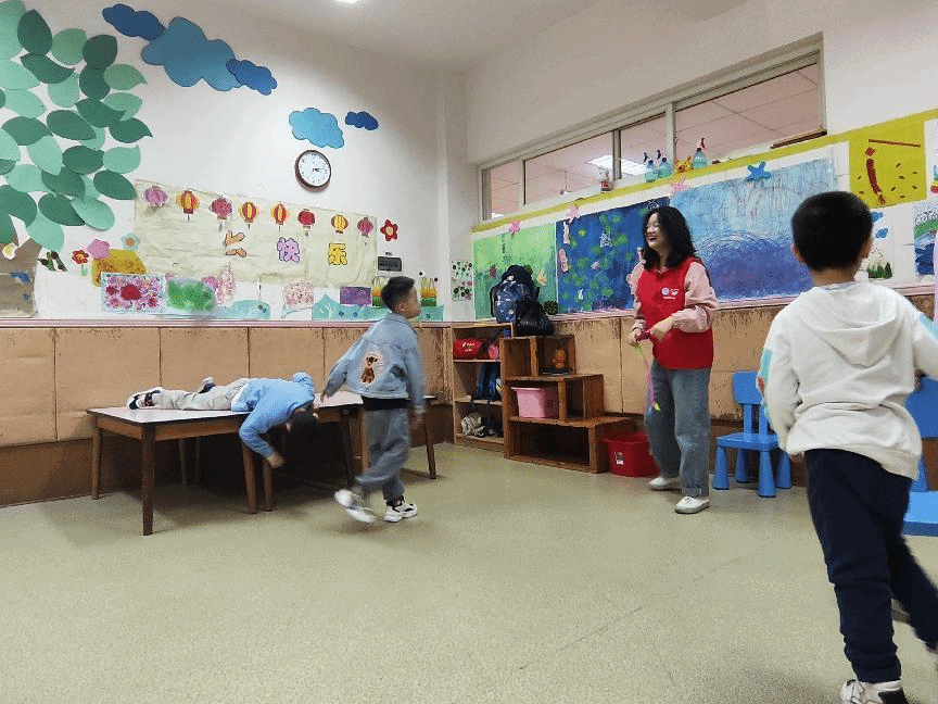 活动主要分为三个部分:游戏课、音乐锻炼课、生活常识普及课。第一组志愿者去到了游戏课教室。在这里,志愿者和老师教孩子们模仿乌龟,兔子等动物的姿态,和小朋友们一起玩各种各样的游戏,在欢声笑语中拉近了彼此的距离,孩子们的真诚和善良的情感也深深地感动了志愿者。