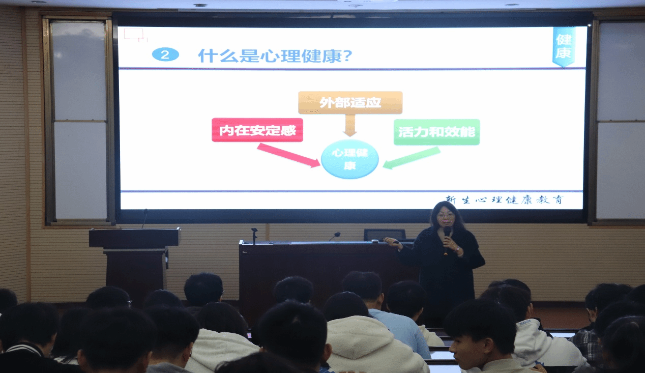 讲座开始时,何老师通过介绍WHO对健康的定义,引入今日的主题“心理健康”,并将心理健康分为内在安定感、外部适应、活力和效能三个部分,深入剖析了心理健康的内涵,使同学们明白了心理健康的定义,不再避讳讨论心理问题。