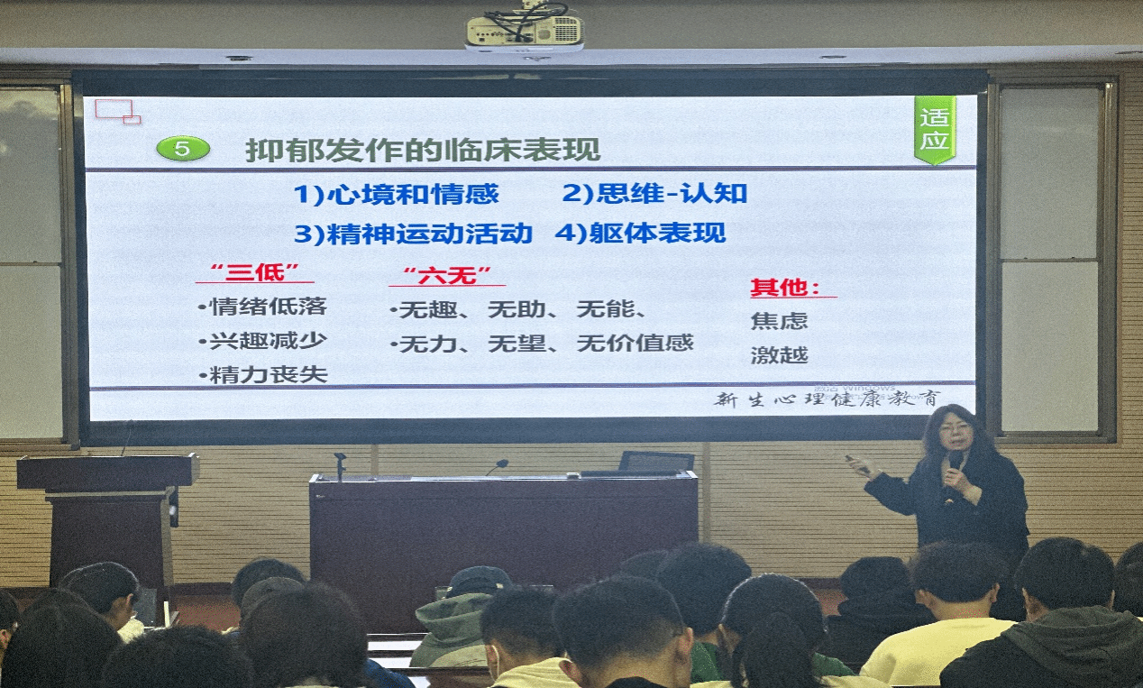 同时何老师对抑郁和焦虑问题也进行了深入的讲解,不仅介绍了抑郁症的病因及其症状,同时也介绍了专业的治疗方法,教育和引导同学们如何正确看待生活中那些形形色色的压力,并找到适合自己的解压方式。