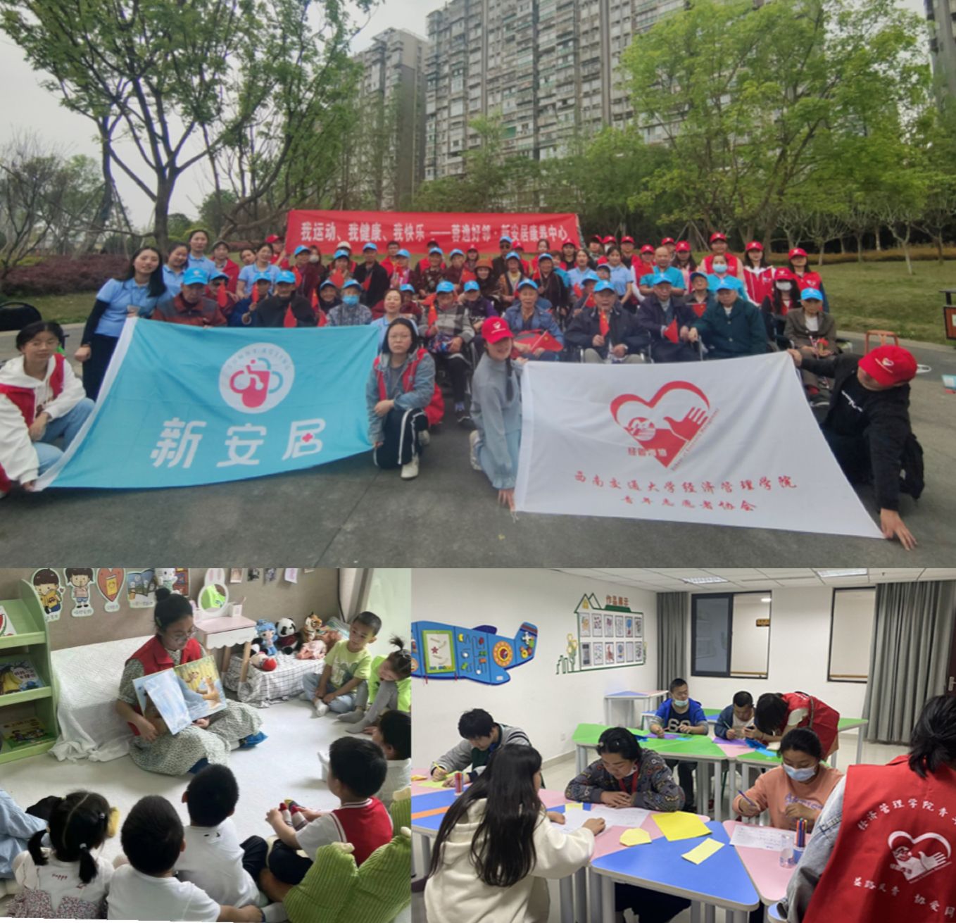 青年志愿者协会深入实施“青春志愿·爱在社区”大学生志愿服务社区行动,与四个社区签订协议并建立长期志愿服务基地,新增“喜安社区”“新安居养老院”两个志愿服务基地,常态化开展“阳光家园”、“敬老院”、“善工家园”、“交大幼儿园”基地志愿服务,将爱心向外蔓延:在金牛区茶店子街道居家养老服务中心为老人送去关怀;在金牛区17吃瓜