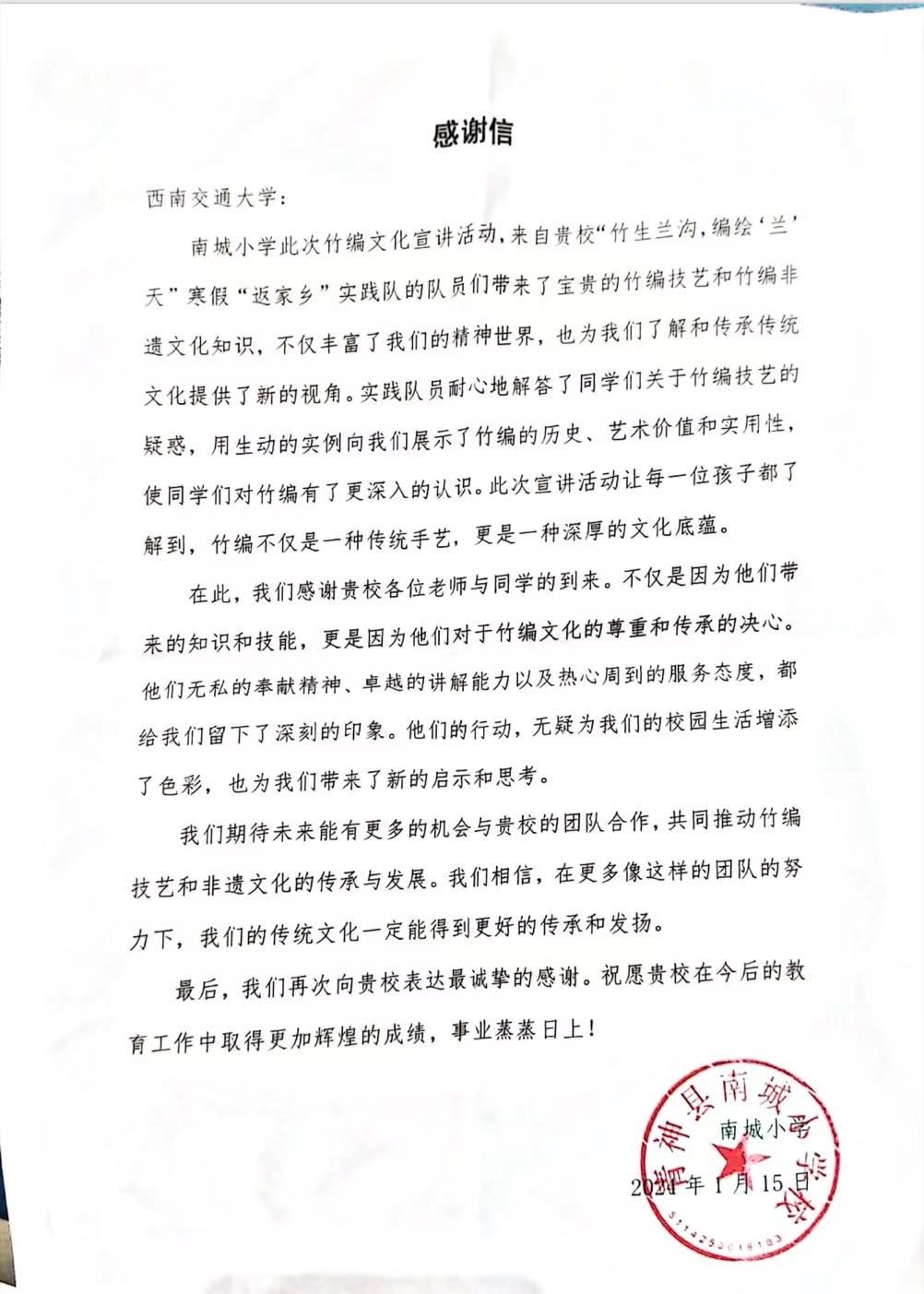 为践行传承非遗文化使命,引导下一代树立正确价值观。1月15日实践团队来到青神县南城小学进行传承非遗文化主题宣讲,带领小朋友们共同制作竹编小船,鼓励他们努力学习、接续传承。南城小学特此为实践团队颁发了表扬信。