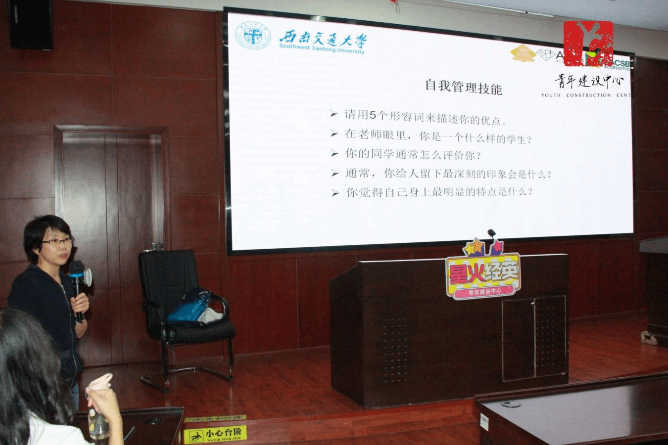 培训伊始,主讲人开门见山点出话题——“生涯规划之我的能力清单”,从能力入手,点明团干部们要点明团干部们要重视对能力的追求。接着她以“去哪里”和“怎么去”两个问题引起团干部们对于生涯目标和生涯路径的思考,并以了解自我为抓手,帮助团干部们了解自我、分析自我、评估自我。随后王哿从专业知识技能、可迁移技能和自我管理技能三个方面阐明了如何提高自我技能,指出挖掘潜能、提升技能的重要性。