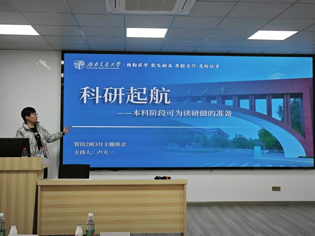本科2023级管信2班“科研起步”主题班会在J0819正式开展。参加本次班级见面会的嘉宾有班导师杨斐老师和2022级会计学专业柯梦清学姐。本次主题班会分为以下4个板块:班级建设概况、守护安全与健康、科研起步知识分享、总结与展望。本次班会由班长卢天一主持。