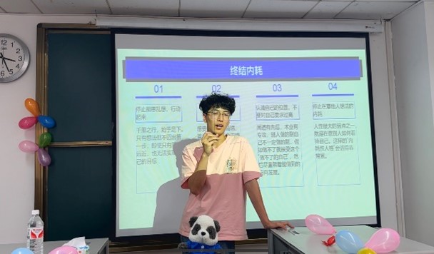 2025年5月9日,2023级经济1班举办了一场以“停止脑海里的战争——和情绪内耗说再见”为主题的班会,由心理委员赵自宇同学担任主讲人,旨在帮助同学们认识情绪内耗,掌握应对方法,促进心理健康。