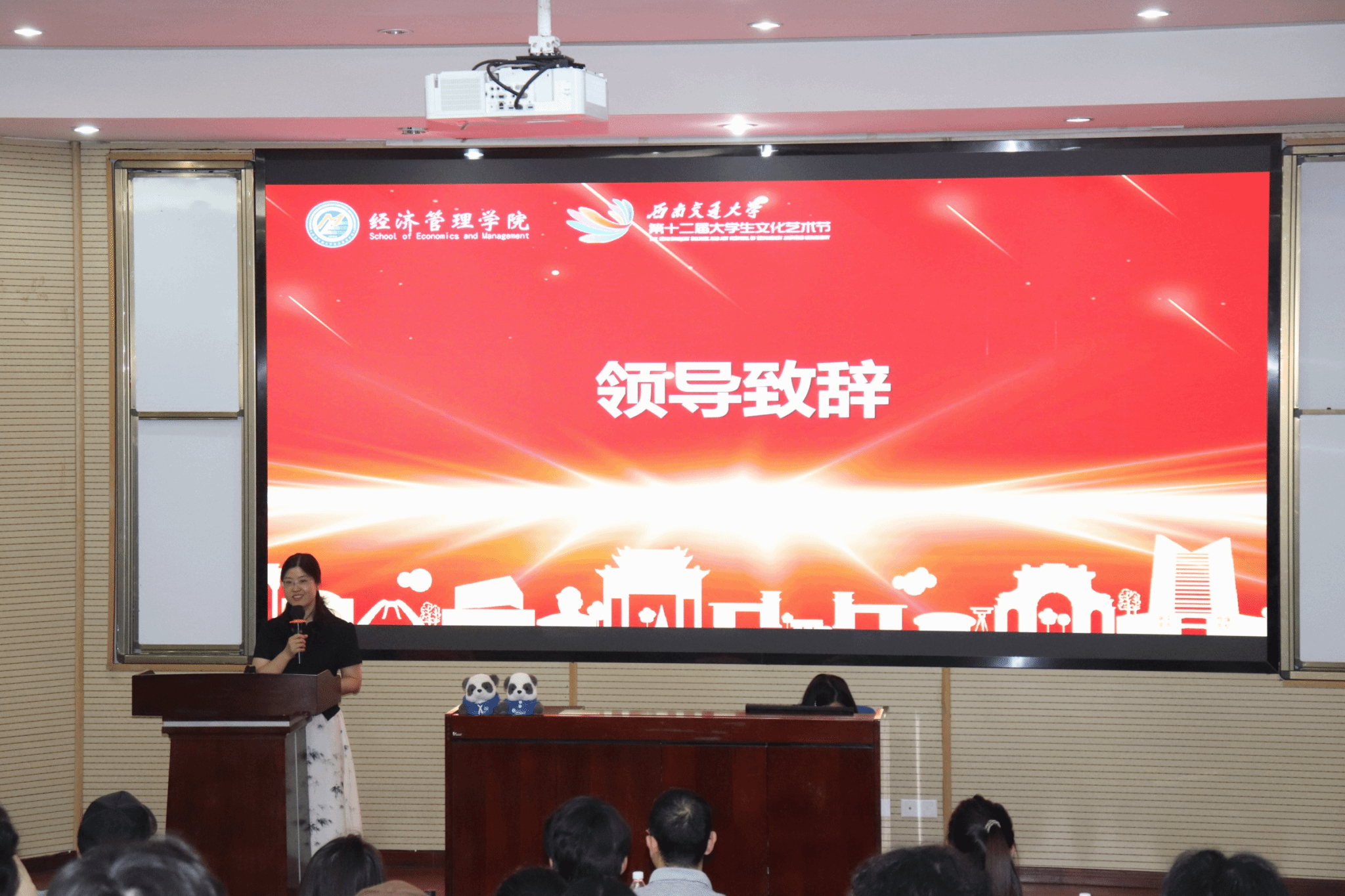 经过评委打分和大众评审投票,各奖项逐一揭晓,由各嘉宾老师为获奖队伍代表颁奖并合影留念。活动最后,余小英老师进行致辞。她表示,此次微电影大赛作品,反映出新时代青年热爱生活、积极进取的精神风貌,给予观众们灵魂和情感的滋养。此次微电影大赛不仅是一场视听盛宴,更是同学们展现创意与才华的重要平台,未来将继续搭建此类交流展示的舞台。期望同学们永远保持赤子之心,用镜头寻找光的方向,在未来的银幕上,继续书写属于新时代交大青年的光影诗篇。