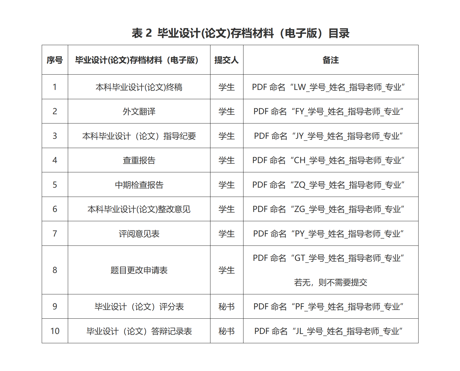 电子版按表2整理后发送至邮箱[email protected],发送同时务必抄送指导老师审核。邮件主题“存档_学号_姓名_指导老师_专业”,附件按表2备注中命名。电子版材料将用于后期毕业设计(论文)抽检工作,请老师同学们高度重视。