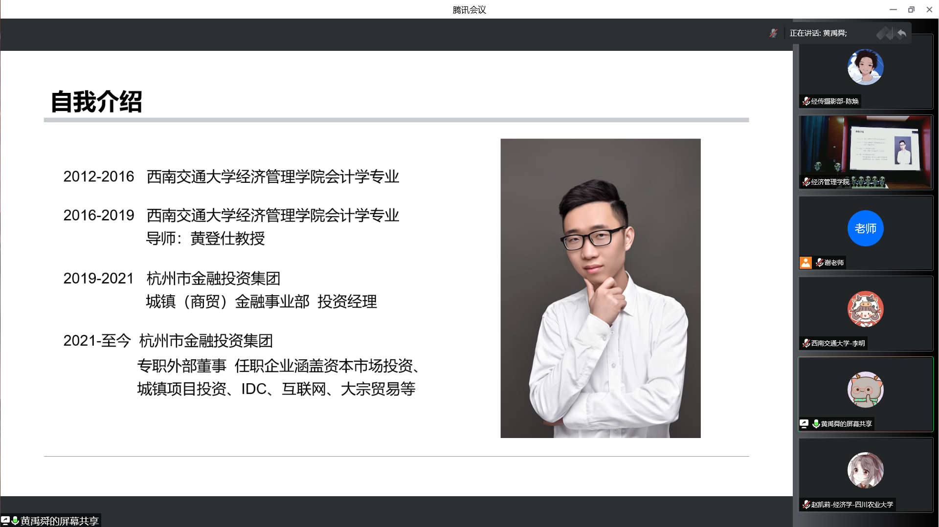 副院长周嘉南教授的主持下,蒋教授为大家带来了“财智与投资”的学术讲座,带大家领略了金融的实用性。同学们与蒋教授进行了热烈的讨论。学院研究生教育中心主任马锋副教授为大家带来了学院学科、学术型硕博生培养情况的介绍。他从学科建设、学术型硕士培养、博士研究生培养等角度,全方位为大家展示了17吃瓜