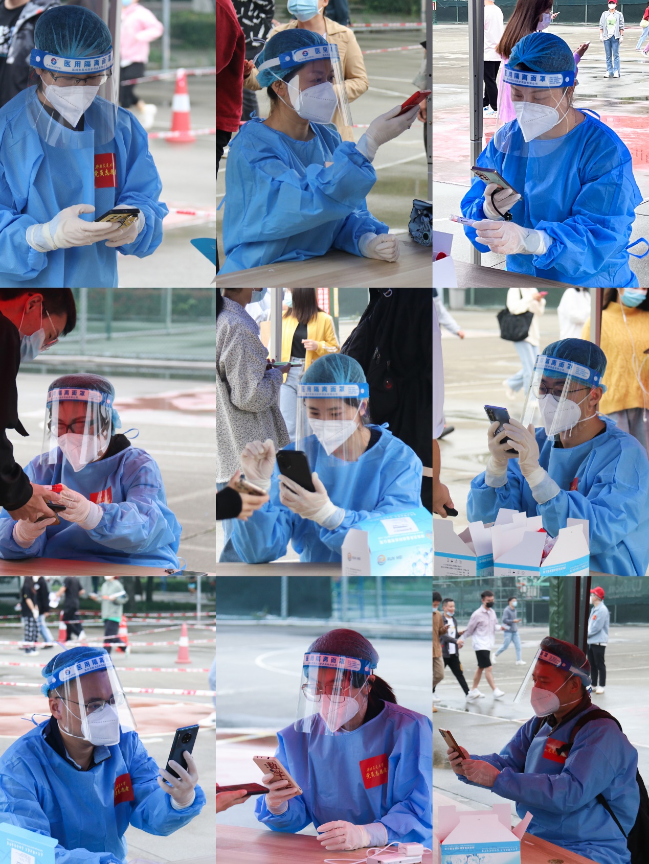老师们到达登记扫码的岗位后,迅速进入了工作状态。他们是核酸检测工作的枢纽,与医护人员密切配合,保证核酸检测顺利的进行;也是同学们安全的“保护罩 ”,扫码传递核酸阴性的证明。四个多小时的工作,他们一直保持着积极的工作态度,坚守到工作结束。“作为学校的一份子,我们应当做一点力所能及的事;作为老师,作为党员更应该走在前面,为疫情防控贡献自己的力量。”诸波说到。此时他们的身份不仅仅是人民教师、是党员,更是平安校园的守护者。