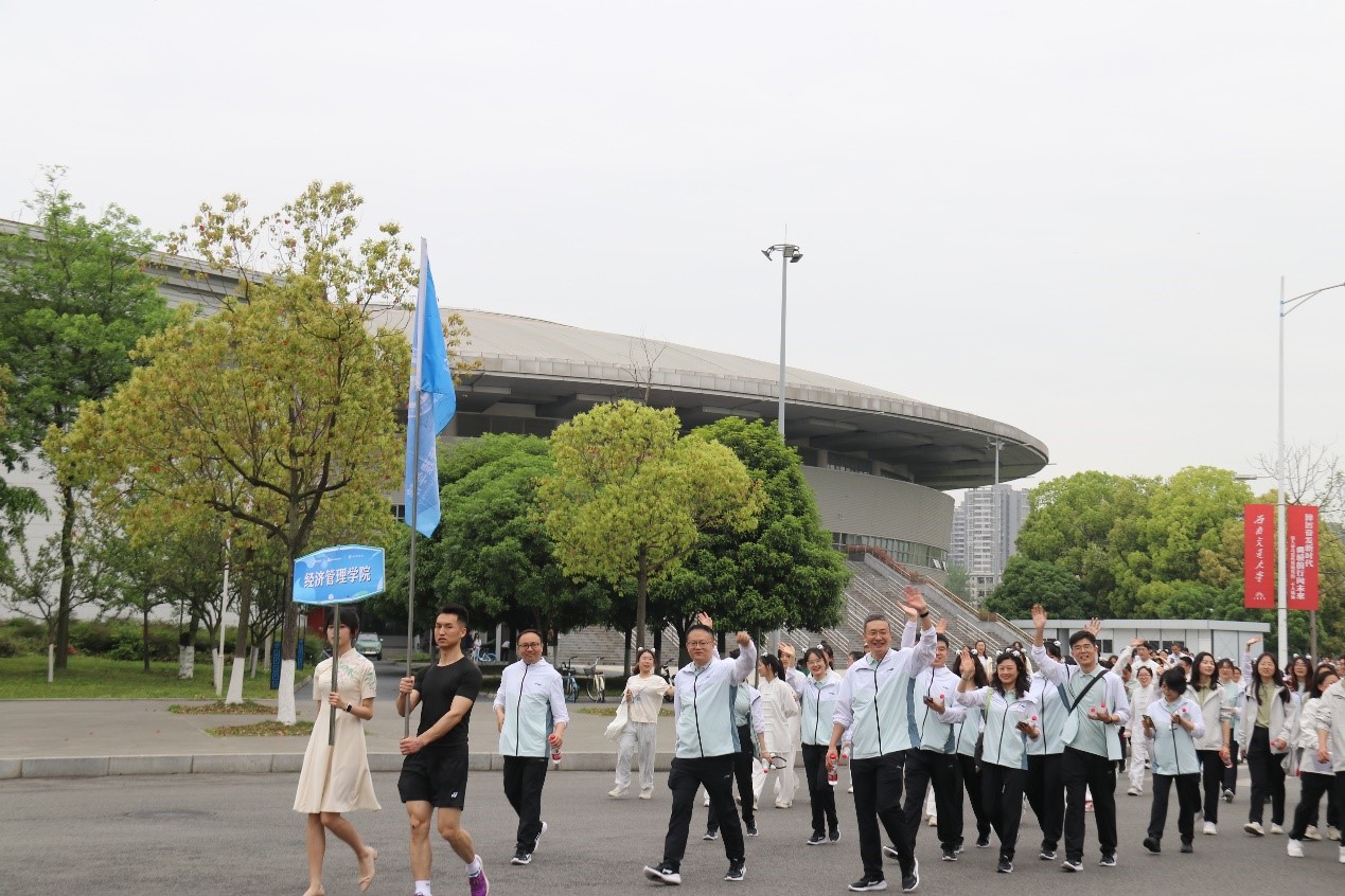 师生方阵院旗高扬,众人同行。经管师生热情高涨,精神抖擞,以饱满的精神状态前进,顺利抵达竢实扬华墙,顺利完成启动仪式。