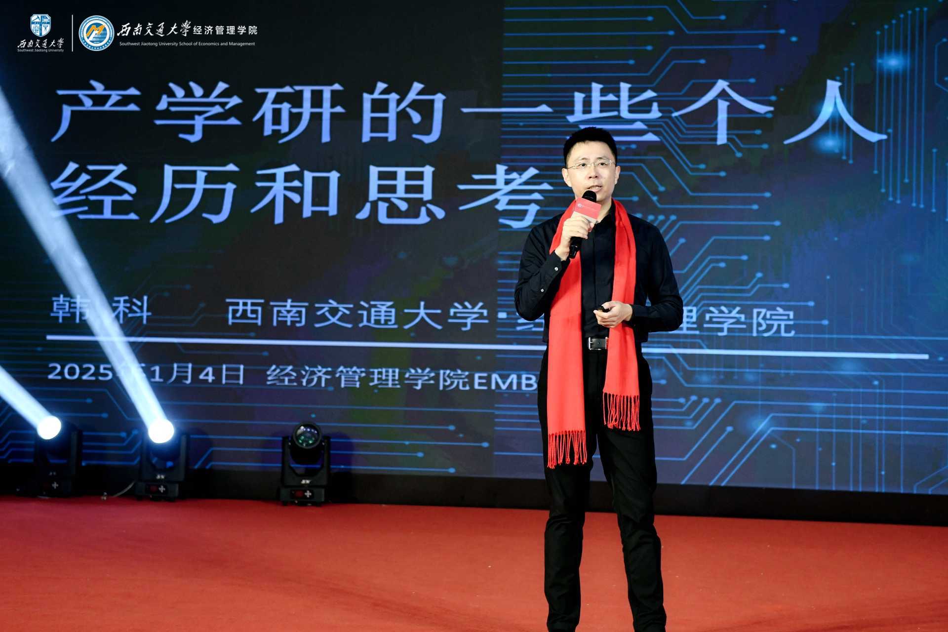 年会的第一个环节是“E生课堂”,旨在为EMBA校友们打造一个持续学习的平台和机会。经济管理学院院长韩科结合自己的经历做了题为《产学研个人经历和思考》主题演讲,分享了自主研发的“以算代测”“以智代工”和“闭环学习”的人工智能核心算法集群“Alpha M APS生态大脑”在智能化大气监测管治领域的应用以及在成都市的部署案例等。他表示,将继续加强与高校、企业和政府的合作,持续发挥产学研合作在成都生态环境治理中的重要作用,不断优化和完善Alpha MAPS平台,拓展其应用领域,为成都的生态文明建设和可持续发展做出更大的贡献。同时,他也鼓励更多的科研人员和企业参与到产学研合作中来,共同推动科技创新和产业升级。