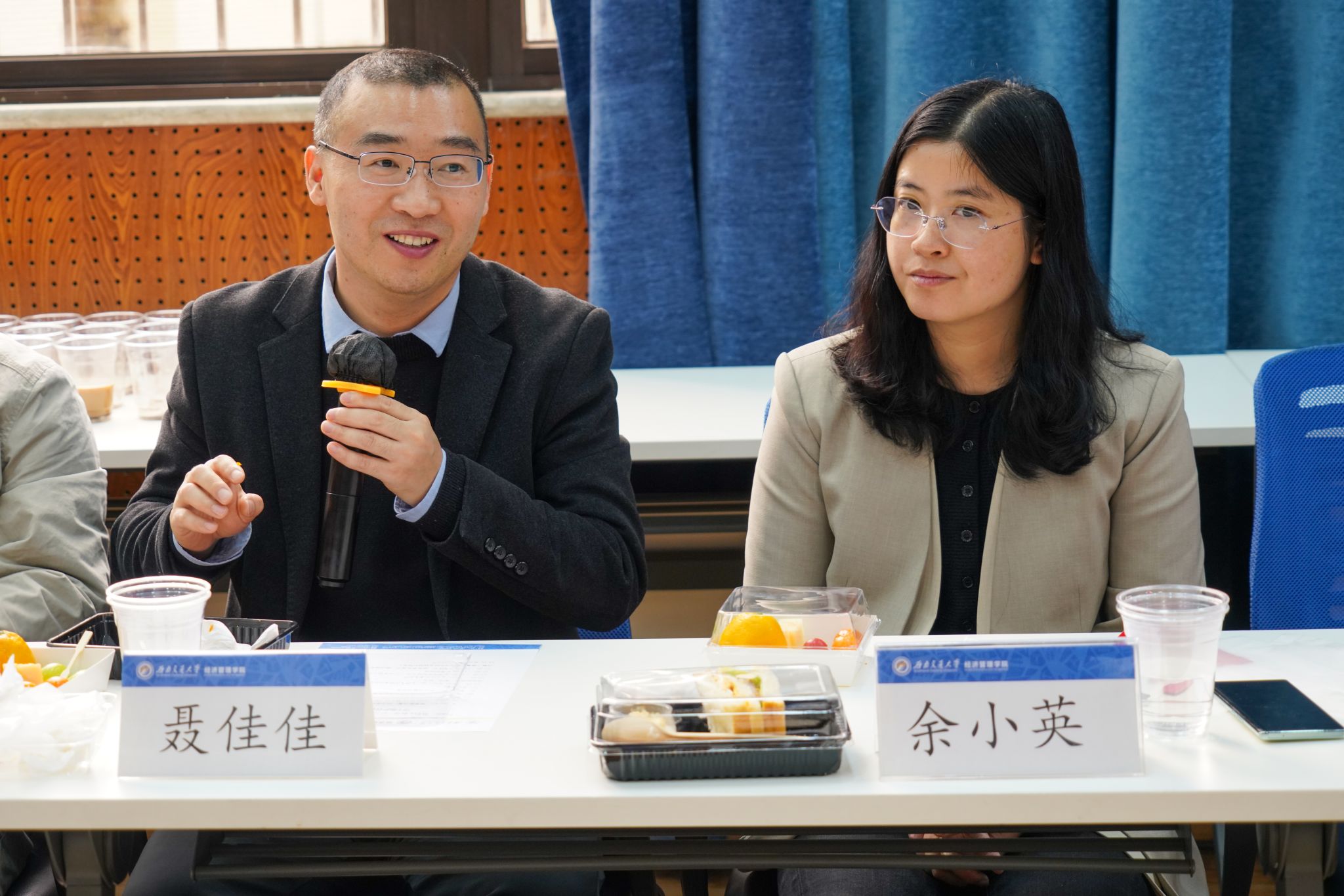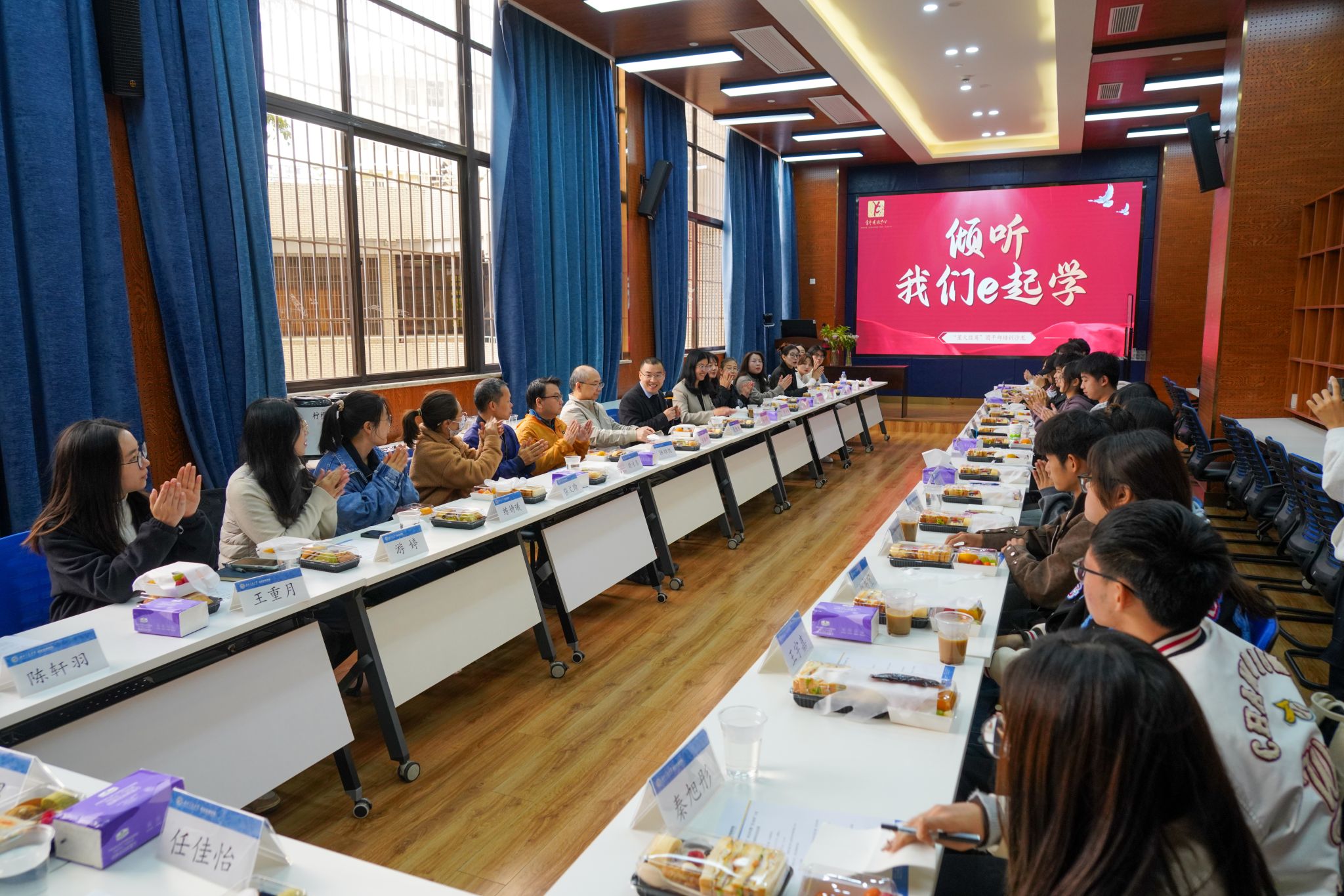 在0218室举行“倾听,我们e起学”班长沙龙交流会,学院党委副书记、纪委书记余小英,副院长聂佳佳,学院各学系、本科教育中心教师代表,本科各年级辅导员,以及二十余位班长代表参与了本次活动。