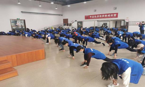 首先,在主持人简单的开场致辞后,志愿者们就开始准备活动热身和体能训练,为后续训练内容进行铺垫。随后老师用通俗易懂的语言、标准的礼仪姿势为志愿者们讲解礼仪的常规知识,对志愿者们的站姿、转体、手位、蹲姿、走姿、行进、微笑等各项礼仪志愿者所应具备的基本礼仪进行专项培训,向志愿者们传达礼仪学习的重要性。