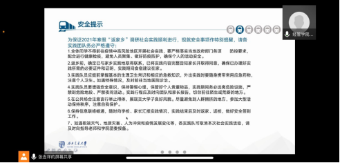 2021年寒假“返家乡”调研社会实践动员培训会在腾讯会议线上如期举行,此次由2020级本科生辅导员陈建奇老师为同学们就此次寒假期间“三下乡”社会实践活动的相关重要事项为话题,和各实践队伍的同学们进行了深入细致的讲解。