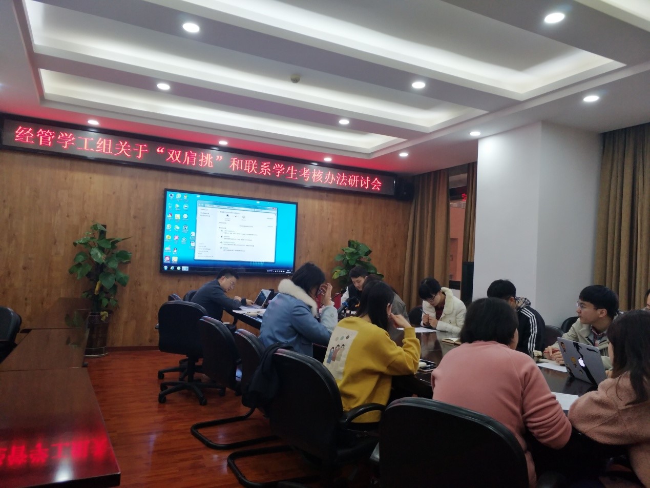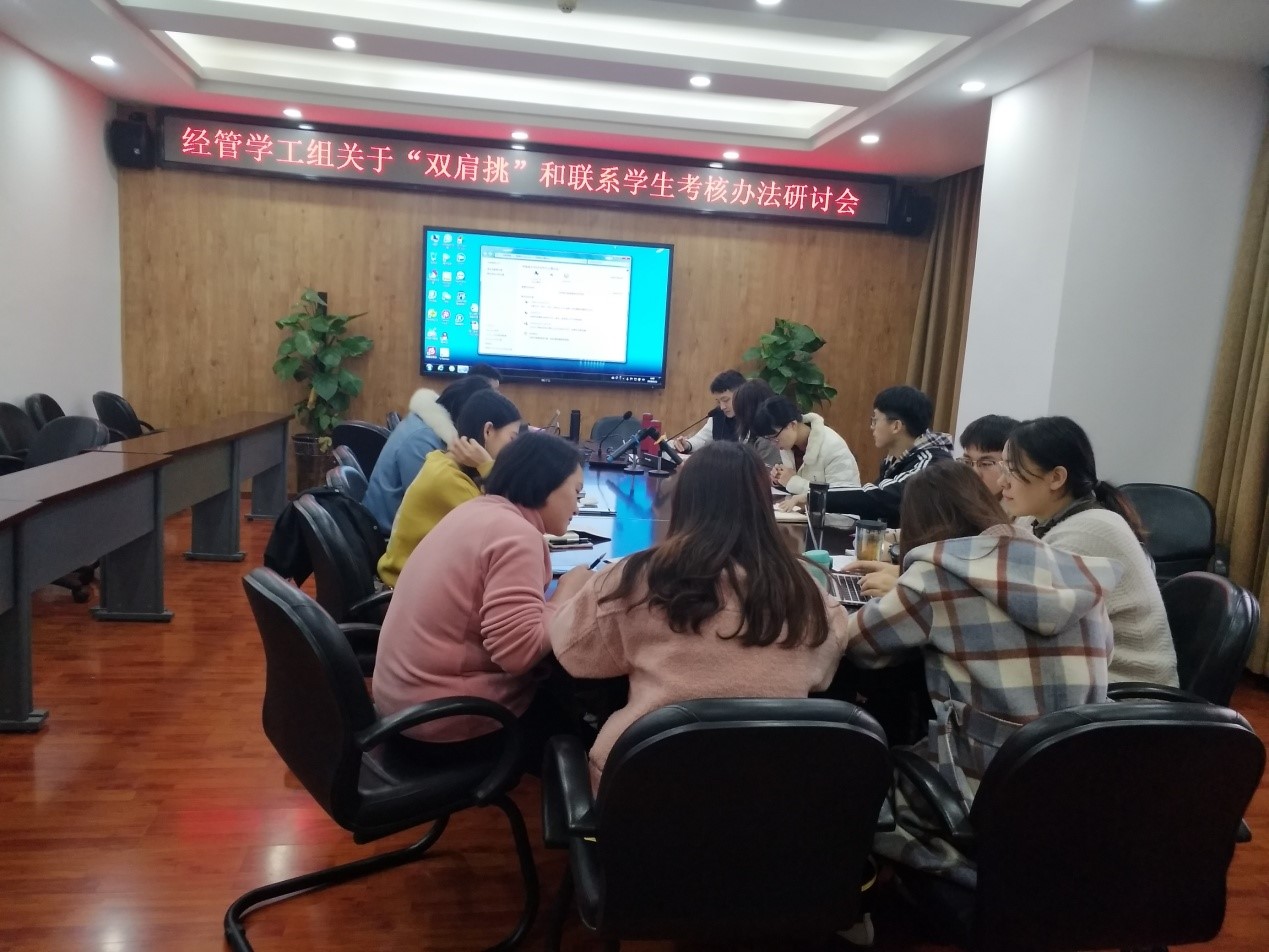 学生工作组关于“双肩挑”和联系学生考核办法研讨会在九里校区0607顺利召开。参加此次研讨会的有经管学院学生工作组副组长贾佳老师,以及部分辅导员。