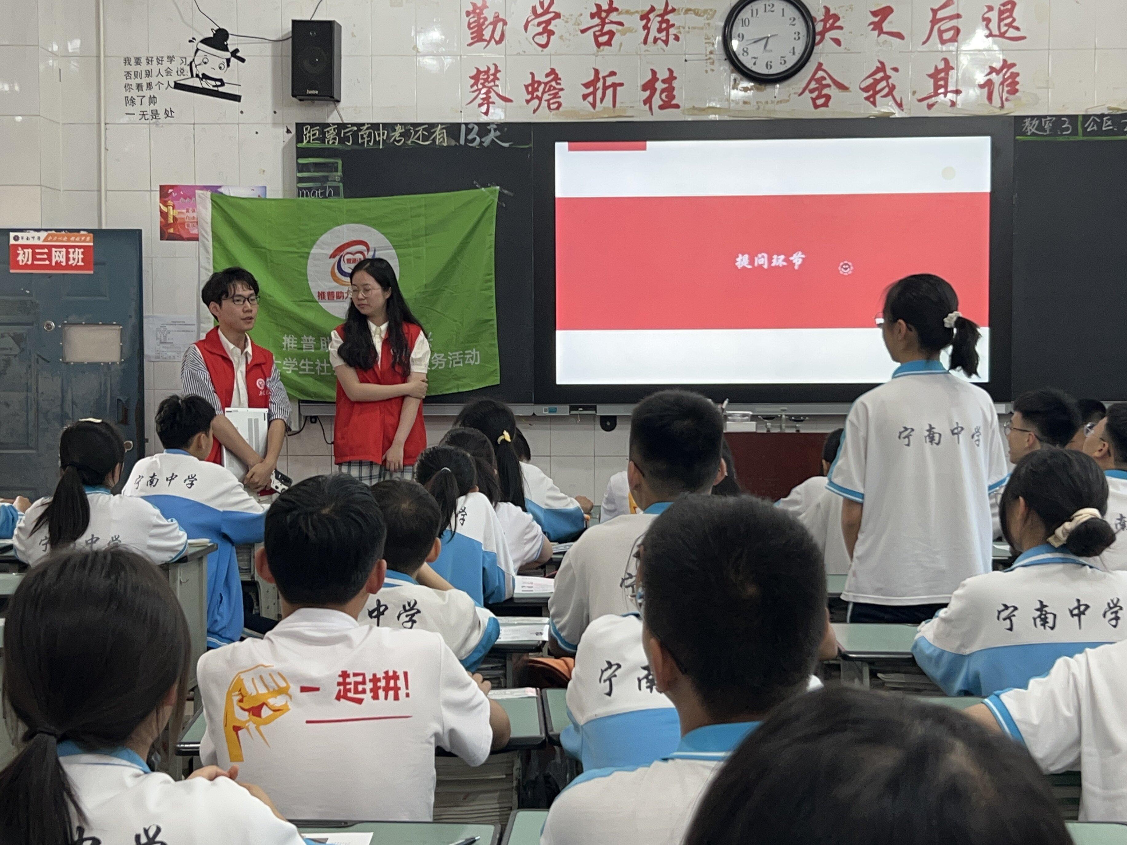 活动最后一天,团队来到了宁南一中,开展普通话线下培训。实践团队从去年在喜德县的推广普通话活动引入,介绍了讲好普通话的重要性,讲好普通话的必要性,讲好普通话的实用性。之后实践团队通过书法鉴赏,诗歌朗读等活动带大家体验普通话的音韵之美。