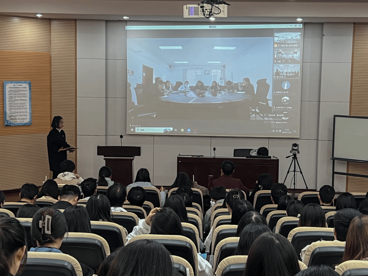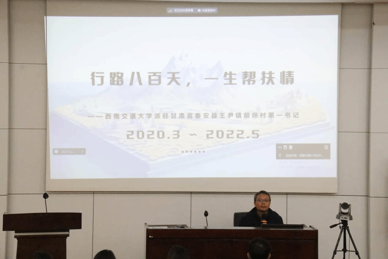 机关第一党支部书记何鹏老师带来了他在甘肃省秦安县的两年驻村帮扶经历分享。行路八百天,一生帮扶情。2020年,何鹏老师带着助力脱贫攻坚收官之战的重担赴陇上任。因饮食习惯差异带来的不适、与成都截然不同的气候、自己一窍不通的西北方言都给何老师的工作带来了不小的挑战,在两年的时间里,何老师不断攻克难关,深深扎根基层,走访调研全村居民,扎实推动党建、脱贫攻坚、巩固拓展脱贫攻坚成果同乡村振兴有效衔接、人居环境整治、疫情防控等地方重点工作,并完善乡村产业链,改善基础设施建设,开展基础教育帮扶,通过多方资源引入了帮扶资金项目数百万元。何老师向同学们分享了他对于基层工作的认识与感悟,也鼓舞同志们树立长远目标,到基层的大舞台施展才干。
