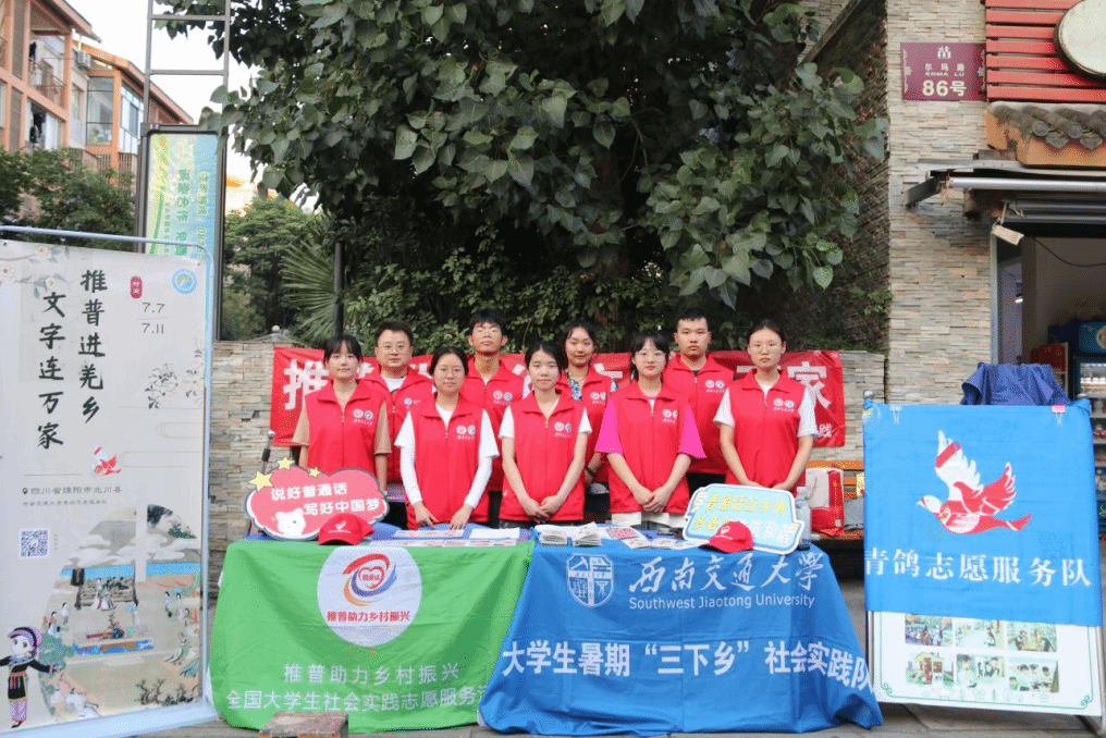“推普进羌乡,文字连万家团队”由学工组指导老师陈建奇带队,于今年7月7日至7月11日深入四川省绵阳市北川羌族自治县开展推广普通话志愿服务活动。实践团队深入当地社区通过走访调研、点位宣传、趣味培训、红色课堂等方式开展普通话调研和推广活动,推进西部少数民族地区语言文字教育,为赓续中华文明倾注青年力量,为北川的文化产业发展注入生机活力,以青春之行助力乡村振兴。活动得到了当地政府、群众的大力支持和一致好评。