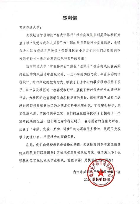 “有我伴你行”实践队以“扶智又扶志,青春新献礼”关爱未成年人教育帮扶为主题,走进四川省内江市威远县严陵镇,联合新时代文明实践所开展丰富多彩的主题实践活动。实践队员们为孩子们带来了丰富有趣的课程:地理小课堂、“心灵奇旅”电影欣赏课、“平安守护”安全科普课、“布艺工坊”织布手工课等,在拓展知识面的基础上,引导孩子们将所学所感与实际生活相结合。实践队还设计了关于传统文化的创新课程:“欢乐绘春节”绘画课,在培养同学们艺术爱好的同时,也扩展了他们的传统文化知识视野,培养了他们的民族认同感。在“剪影行云”剪纸课中,实践队员带着孩子们认识剪纸的主要形式和意义,在感受新春佳节氛围的同时,也不断学习中华民族传统文化。活动结束后,实践团队收到了来自吴荣路社区的感谢信。