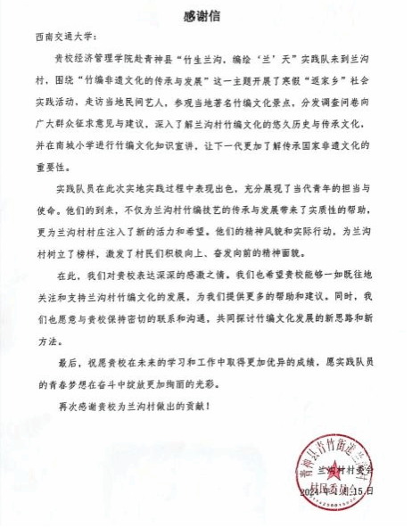 “竹生兰沟,编绘‘兰’天”调研走访实践队来到四川省青神县兰沟村开展以“深挖青神竹编,宣扬非遗文化”为主题的五天调研实践活动。实践团队首先抵达中国竹编艺术博物馆进行参观,并在第二天拜访了殷超竹编工作室,随后调研团队前往采访了国际竹编大师陈云华老师。小组成员抵达兰沟村居民点后,实地走访居民65户。此外,实践团队还来到青神县南城小学进行传承非遗文化主题宣讲,鼓励他们努力学习、接续传承。南城小学特此为实践团队颁发了感谢信。