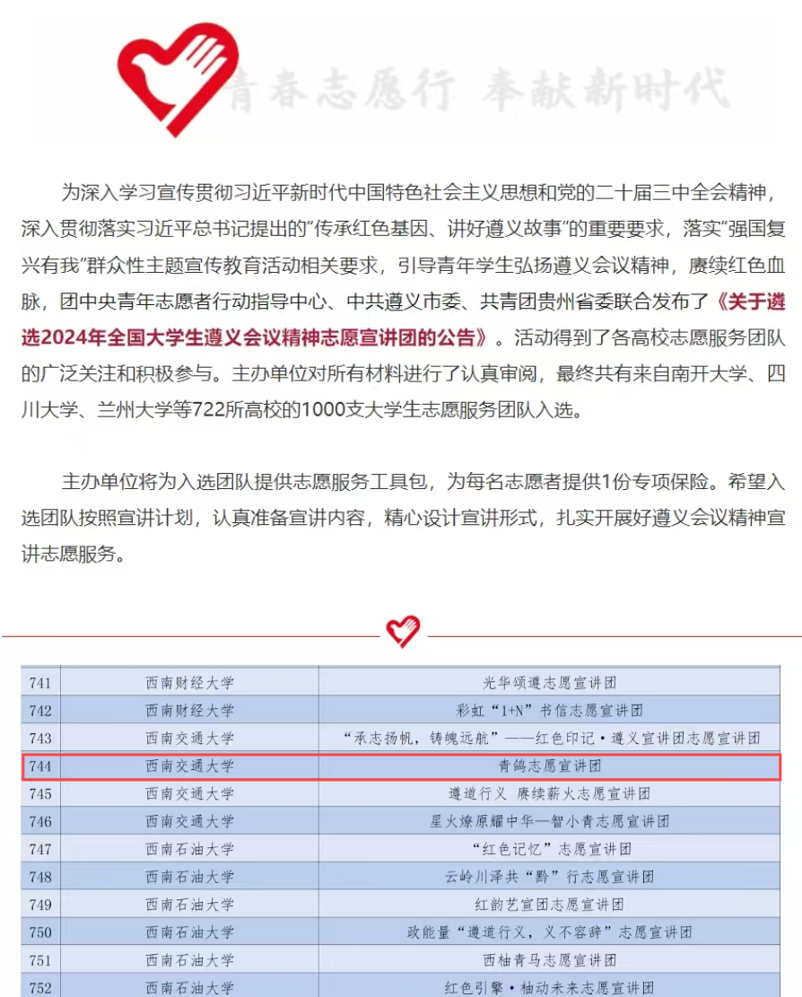 “青鸽志愿服务队”从全国千余所高校的几千支队伍中脱颖而出,同时入选2024年全国大学生遵义会议精神志愿宣讲团和沂蒙精神志愿宣讲团。