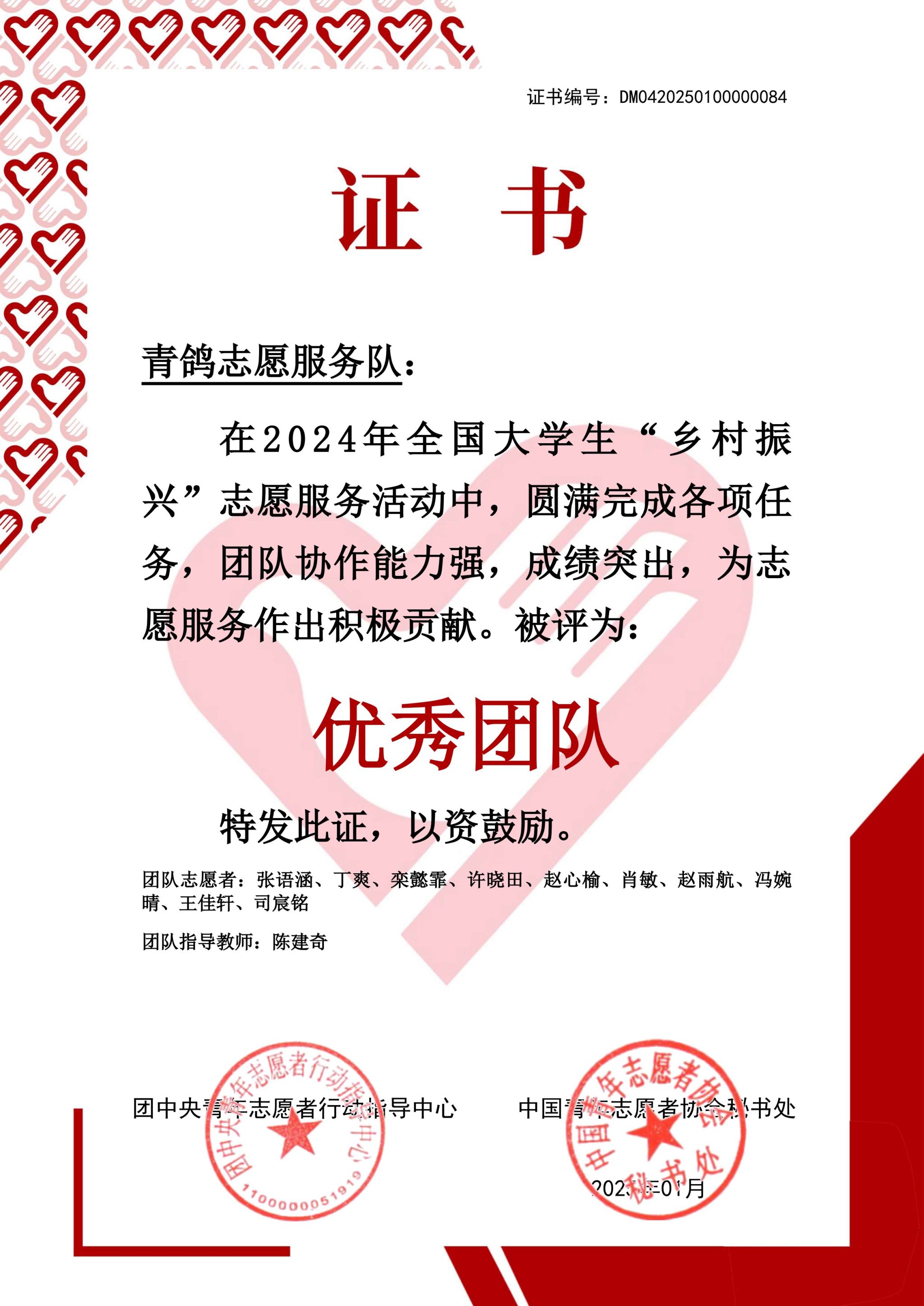 青鸽志愿服务队“乡村振兴”志愿服务团凭借其出色的表现和显著的成绩,荣获优秀团队。