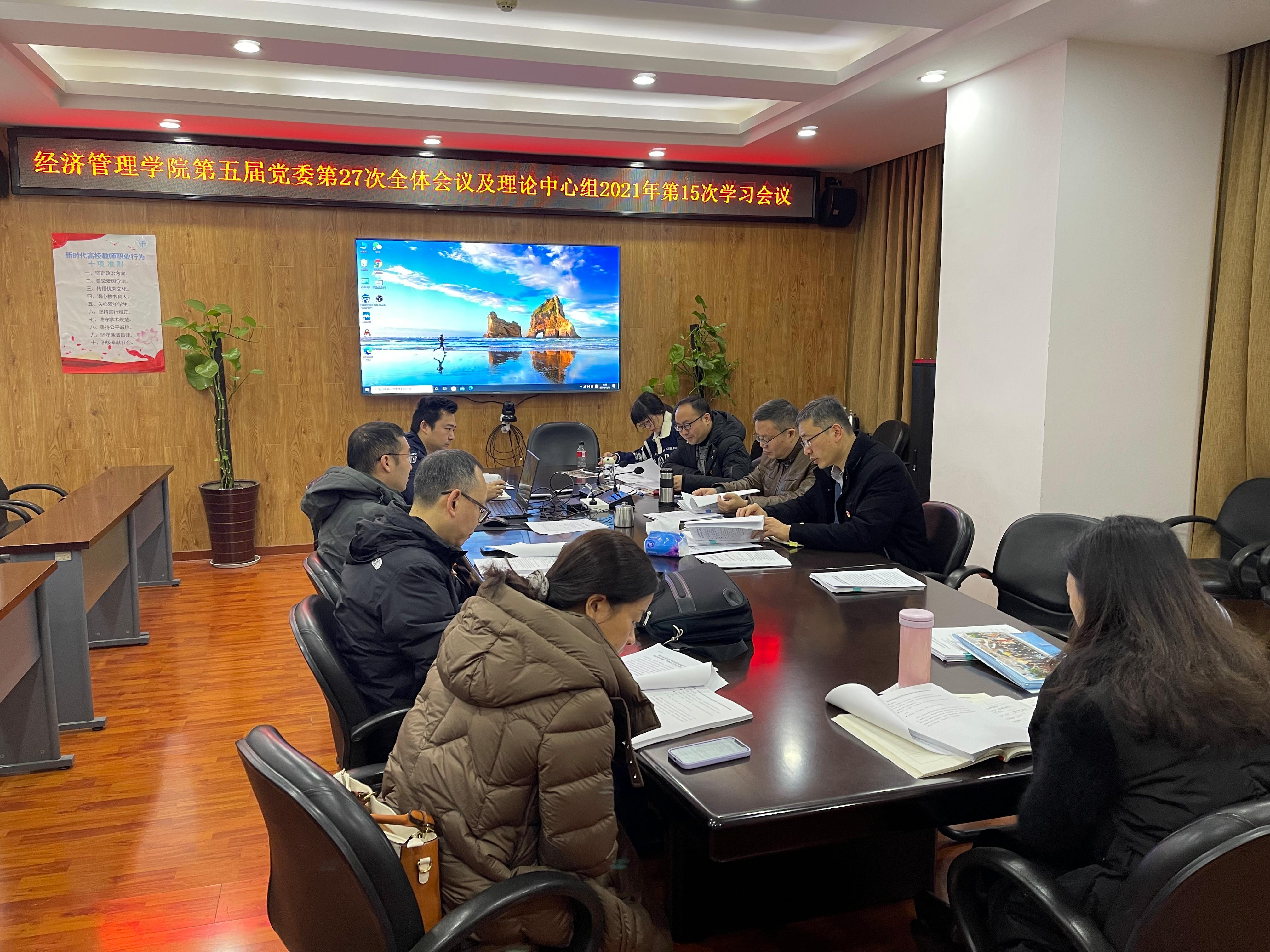 第五届党委在九里校区零号楼0607会议室召开了第27次全体会议,并进行了2021年第15次理论学习中心组学习。会议和学习由学院党委书记王斌主持。
