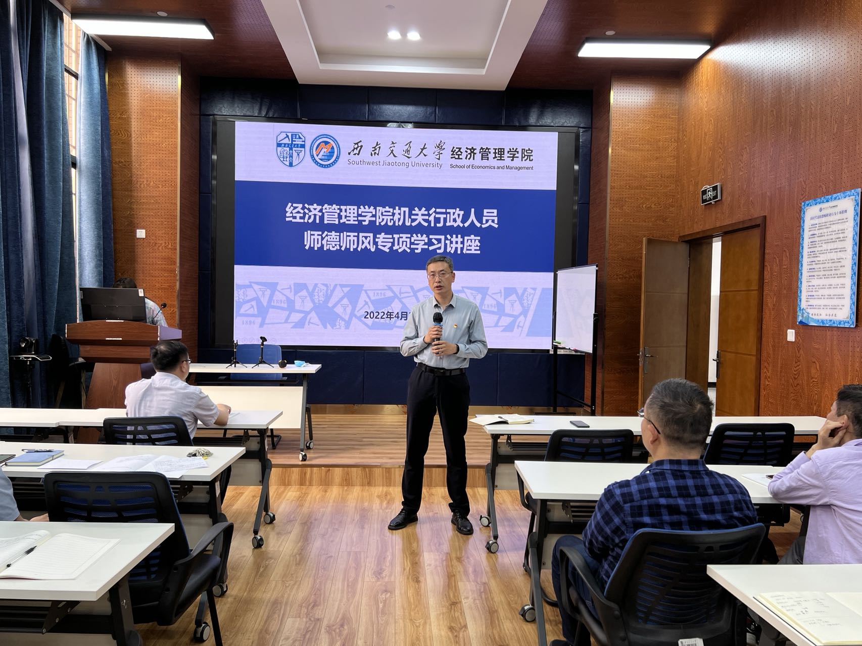 师德师风建设应知应会专项学习的通知》要求,2022年4月28日下午4点,学院机关第一和第二党支部在九里校区0218会议室组织管理岗工作人员集中开展了师德师风建设专项学习教育。