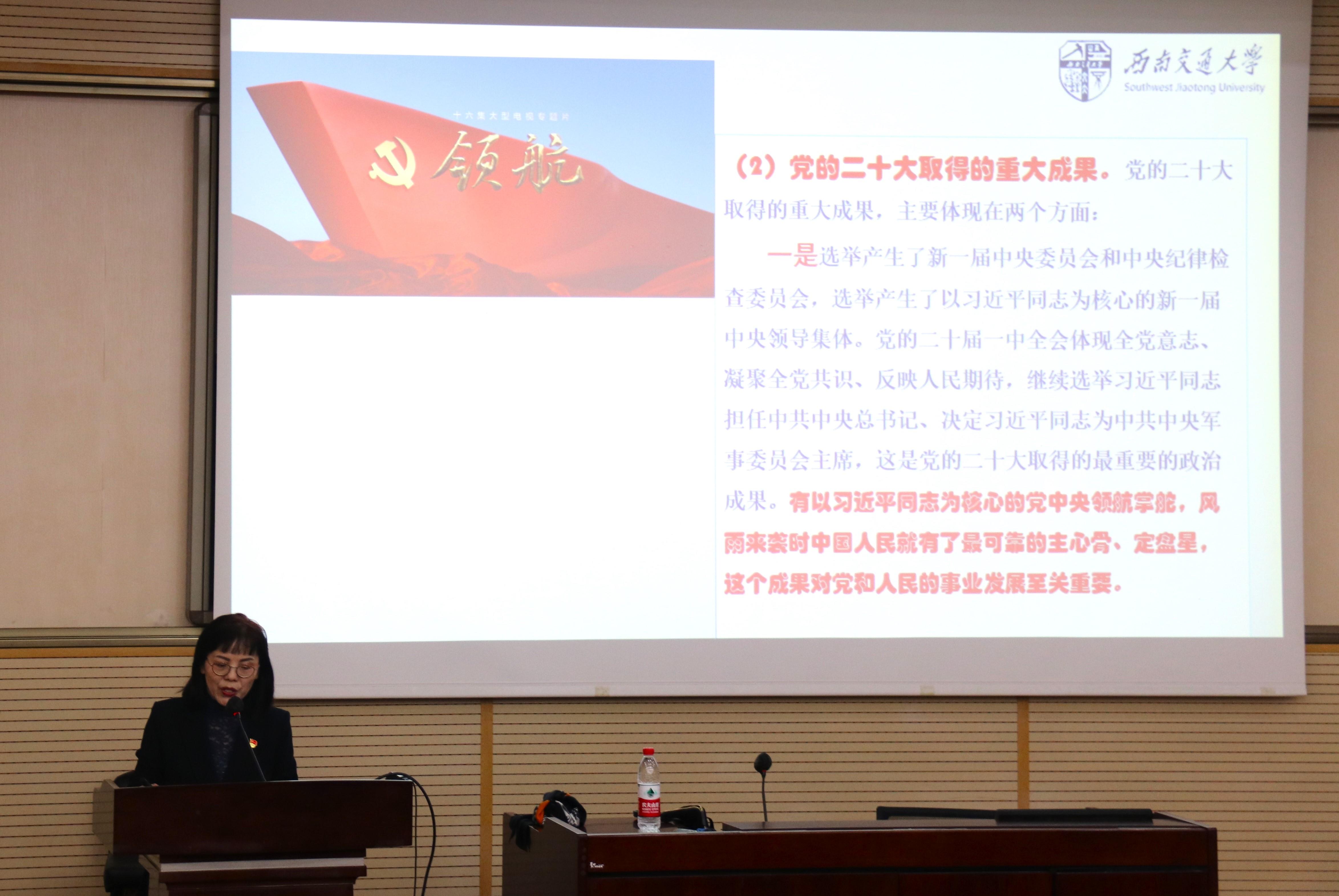 马克思主义学院教授何薇老师于11月10日下午在九里校区0202教室作题为《学报告悟思想开新局——深入学习领会党的二十大精神 坚定不移推进全面从严治党》的专题报告。讲座由学院党委书记王斌主持,学院党委委员、院领导、各师生党支部委员参加了此次专题讲座。