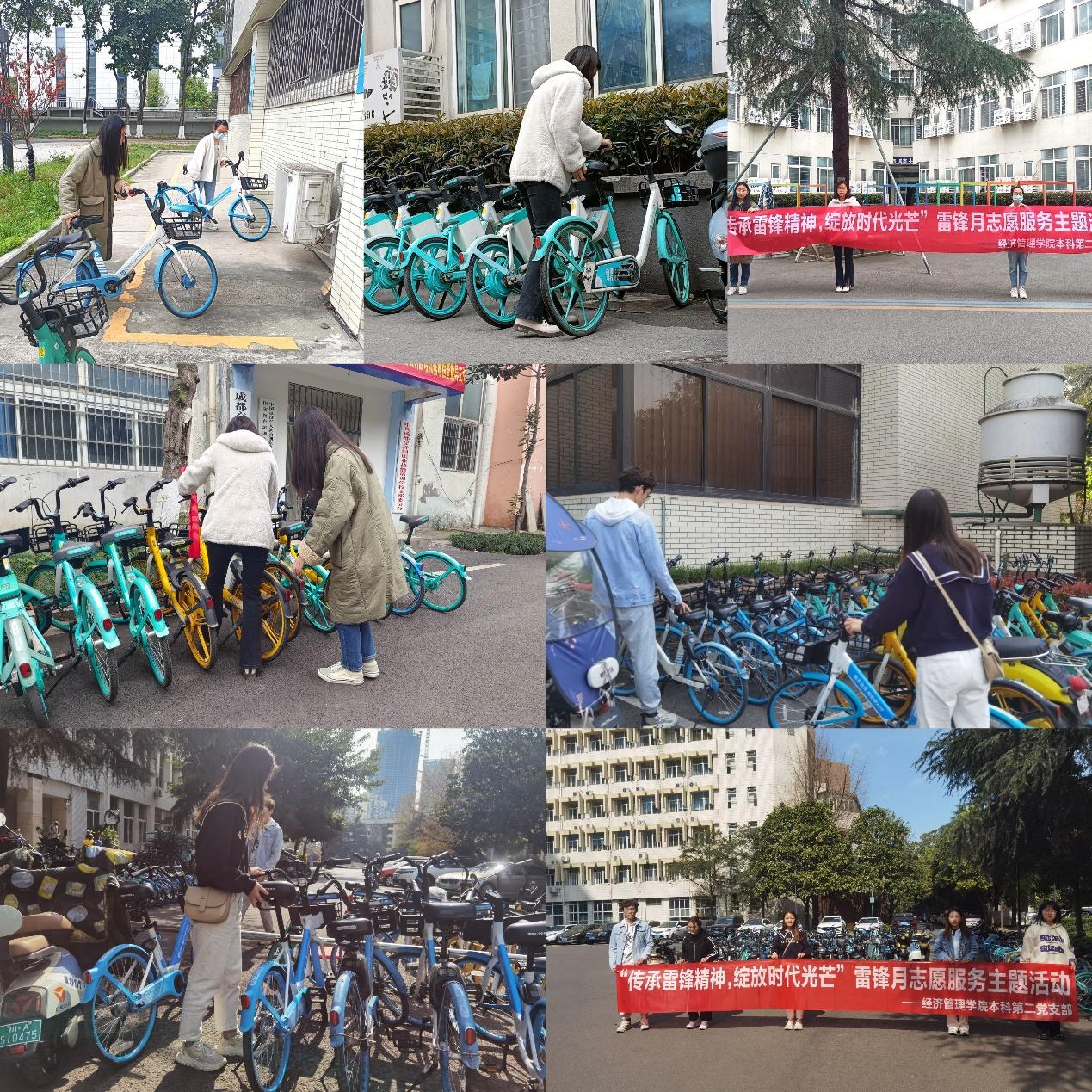 共享单车入校园,对便捷师生出行具有重要意义,但是共享单车乱停放不仅挤占了校园通道,也影响了校园容貌。此次志愿活动,党支部的部分志愿者同学针对园区内的共享单车进行了规范停摆,维护校园面貌整洁有序,让校园春色更美丽。