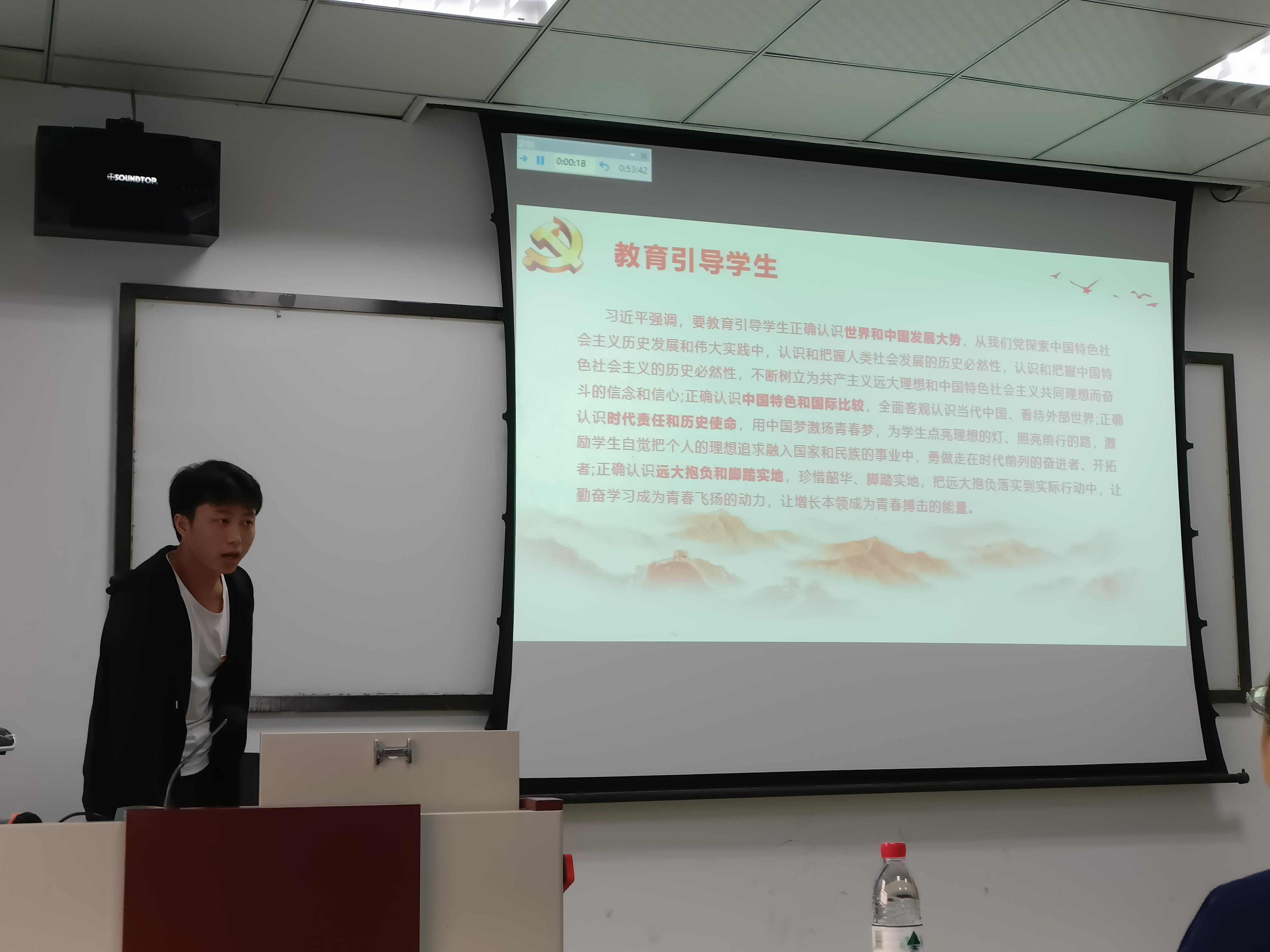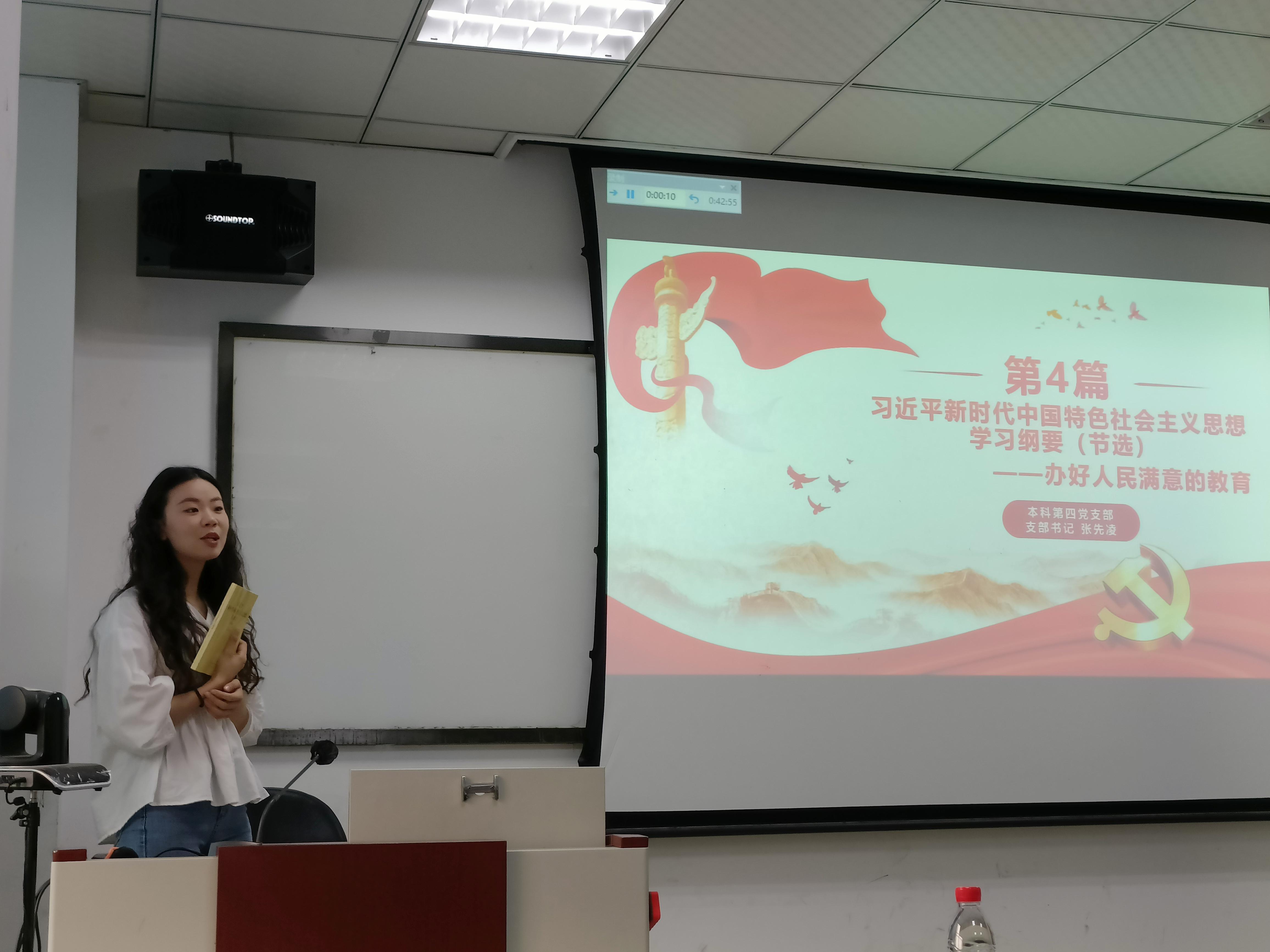 本科第四党支部书记张先凌、青年委员鄢敏辉、本科生党员崔鹏硕分别对《习近平新时代中国特色社会主义思想学习纲要》(节选)、《习近平总书记在全国高校思想政治工作会议上的讲话》、《习近平总书记关于教育的重要论述》进行领学述学,鼓励青年同志树牢共产主义远大理想和中国特色社会主义共同理想,做有情怀、有理想、有担当的青年,切勿“吃祖宗饭,砸子孙碗”,努力成为德智体美劳全面发展的社会主义建设者和接班人。