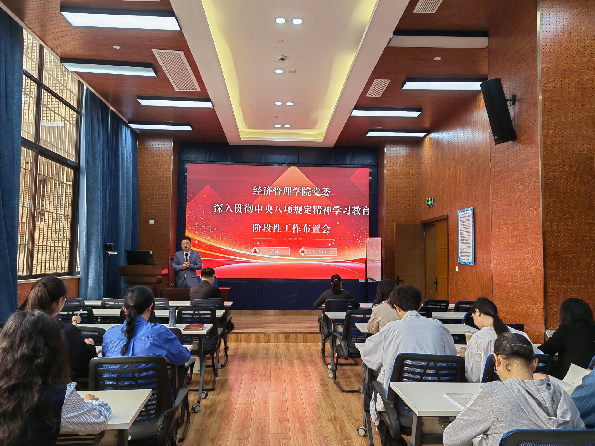 2025年4月22日,学院党委在0218教室召开深入贯彻中央八项规定精神学习教育阶段性工作布置会,学院党委书记郭强、副书记余小英、党委组织员以及师生党支部书记30余人参加了会议。