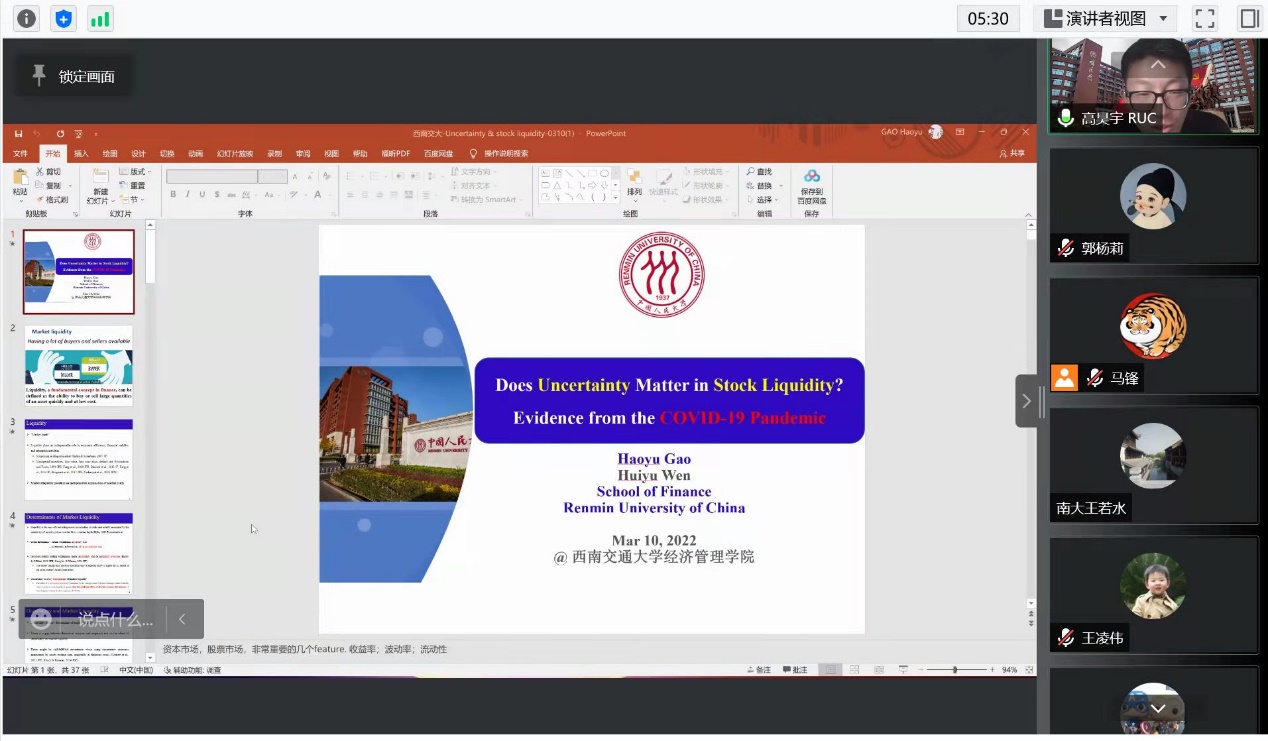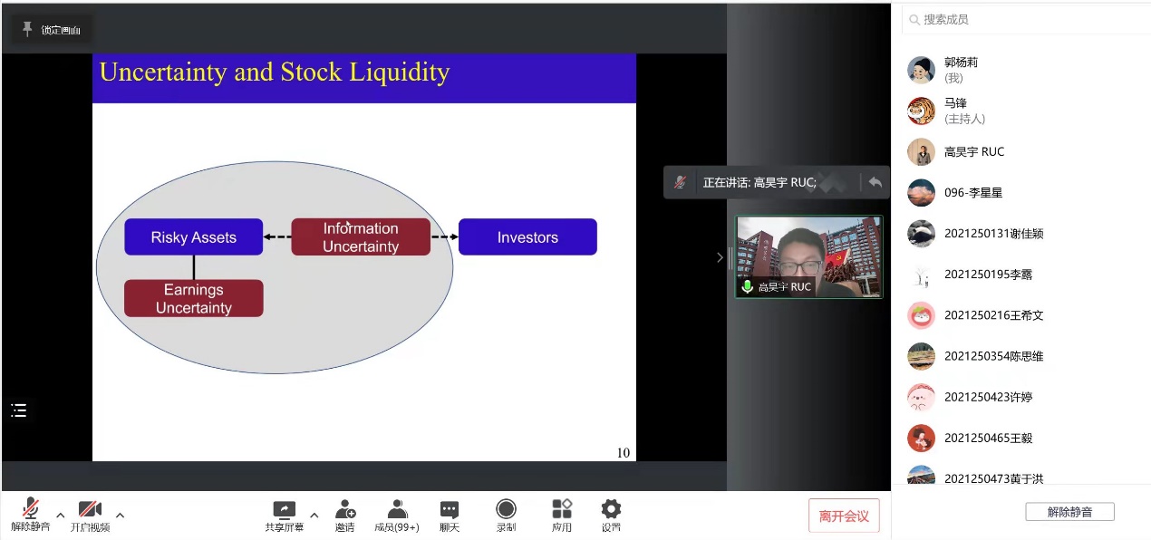 2022年3月10日上午10点,中国人民大学财政金融学院高昊宇副教授的学术讲座在线上举行。高昊宇副教授以“Does Uncertainty Matter in Stock Liquidity? Evidence from the COVID-19 Pandemic”为主题进行了精彩的分享。本次学术活动由17吃瓜