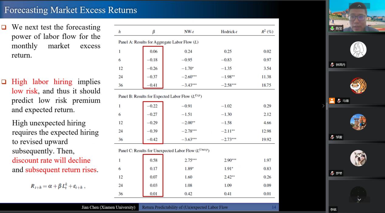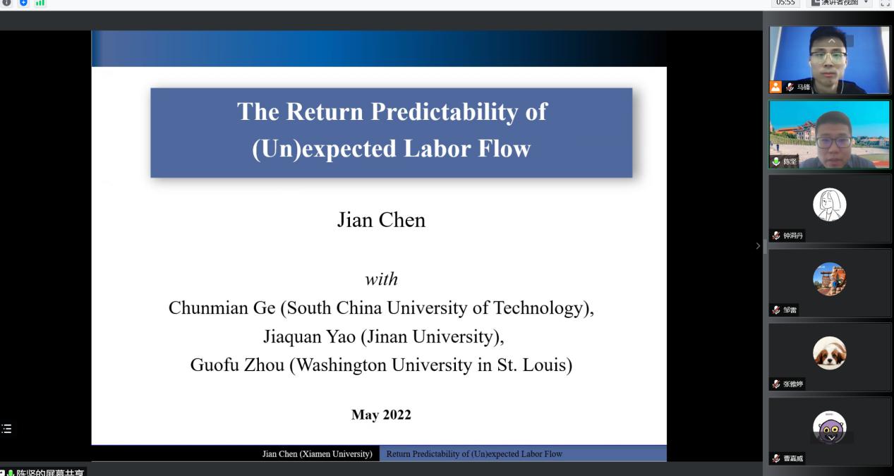 2022年5月17日上午10点,厦门大学经济学院陈坚教授的学术讲座在线上举行。陈坚教授以“The Return Predictability of (Un)expected Labor Flow”为主题进行了精彩的分享。本次学术活动由17吃瓜