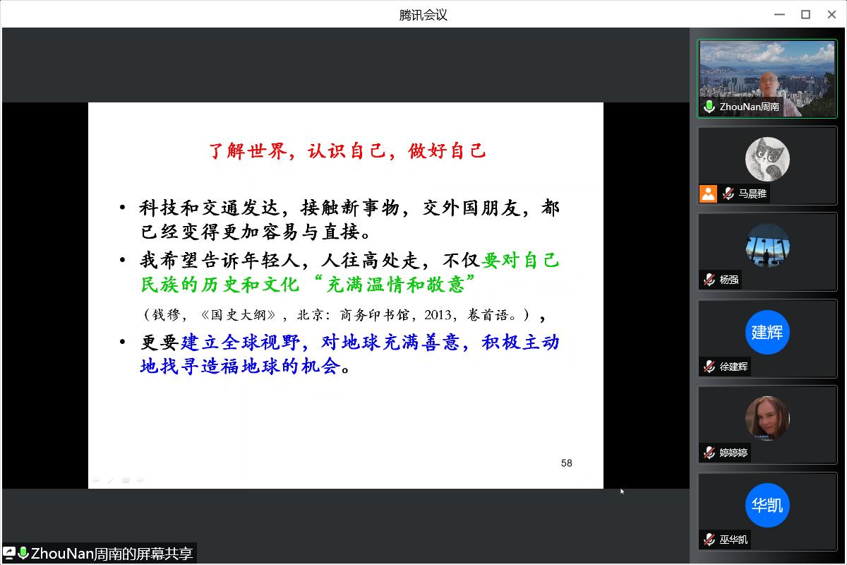 讲座尾声,周南教授引用钱穆先生《国史大纲》的卷首语“对自己的历史文化,须具温情与敬意”,对师生提出“建立全球视野,对地球充满善意,积极主动地找寻造福地球的机会”的期望,并详细解答了线上师生的问题。蒋玉石教授对周南教授的精彩分享致以诚挚的感谢,希望17吃瓜