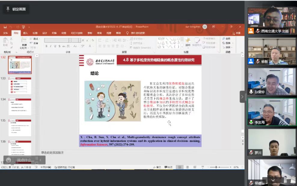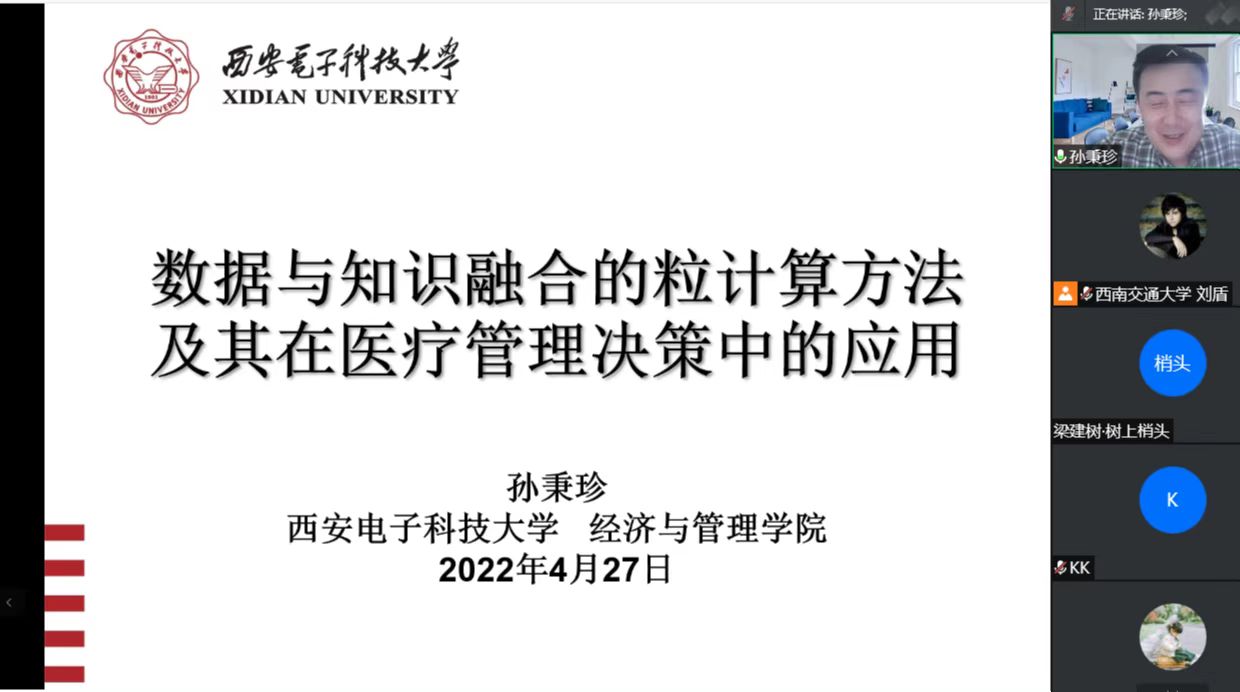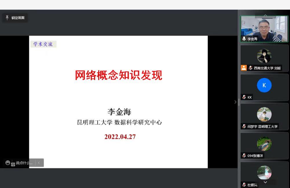 2022年4月27日下午2点,西安电子科技大学孙秉珍教授和昆明理工大学李金海教授应邀在腾讯会议上分别开展了题为“数据与知识融合的粒计算方法及其在医疗管理决策中的应用”、“网络概念知识发现”的线上学术报告。17吃瓜