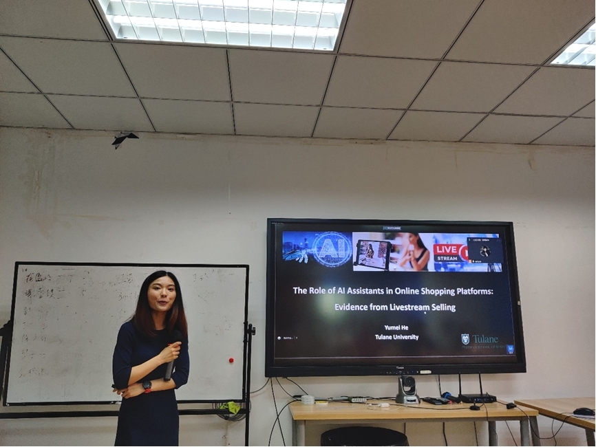 2023年6月16日上午,杜兰大学弗里曼商学院助理教授何玉梅应邀在学院0411室开展题为“The Role of AI Assistants in Livestream Selling: Evidence from a Randomized Field Experiment”的学术讲座。讲座由学院信息系统与运营管理系刘盾教授主持,17吃瓜