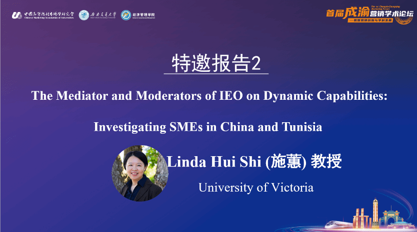 第二场特邀报告中,来自加拿大维多利亚大学(University of Victoria)商学院的Linda Hui Shi(施蕙)教授作了主题为“The Mediator and Moderators of IEO on Dynamic Capabilities: Investigating SMEs in China and Tunisia”的报告。她与合作者们研究了企业动态能力在国际创业导向与绩效关系中的中介作用,分析了制度距离与文化距离的调节作用,为发展中国家创业企业如何通过国际化与数字化手段来克服文化与制度的障碍提供了新的解释。