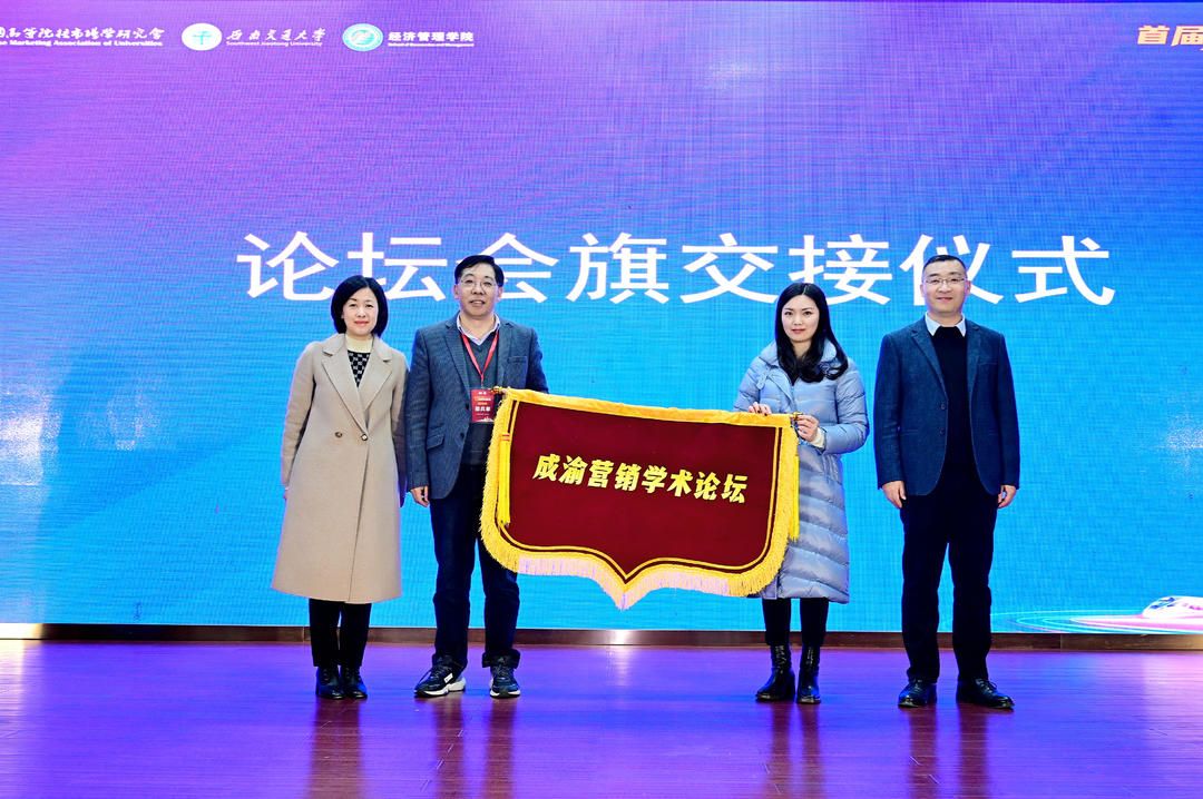聂佳佳副院长、周嘉南副院长与重庆大学邵兵家教授、重庆工商大学江霞老师交接了会旗。周嘉南副院长致闭幕词,她对首届成渝营销学术论坛的顺利举办表示热烈祝贺,对参与本次会议筹备的专家、老师和志愿者们的辛勤付出表示感谢,并代表学院对各位专家学者的莅临表示诚挚的谢意,祝愿川渝两地高校的交流合作在成渝营销学术论坛中不断深化与升华。