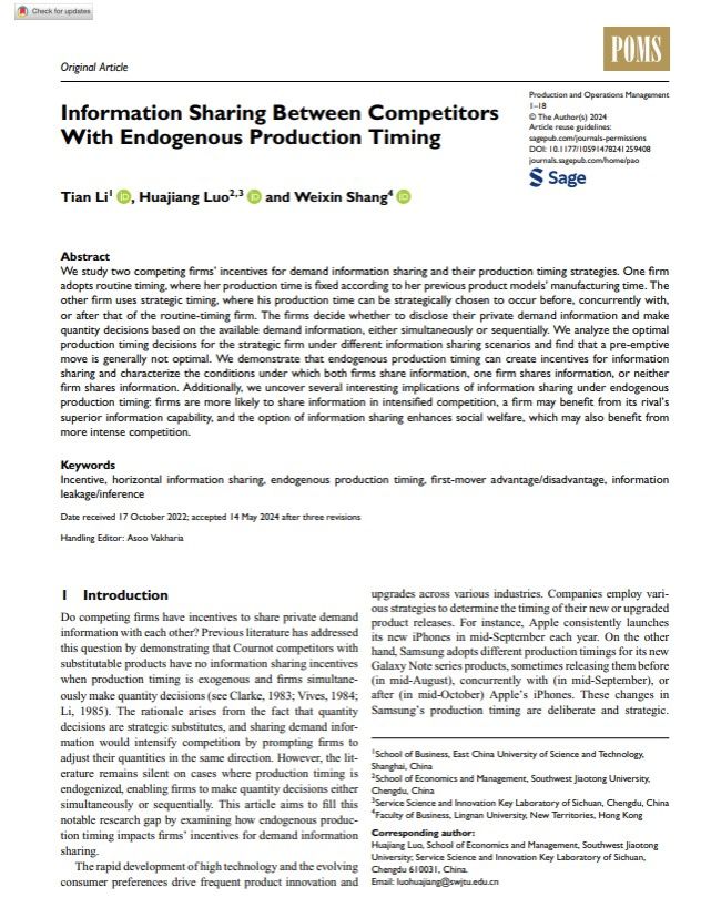 罗华江老师于2024年6月在UTD 24期刊Production and Operations Management在线公开发表题为《Information Sharing Between Competitors With Endogenous Production Timing》的论文。