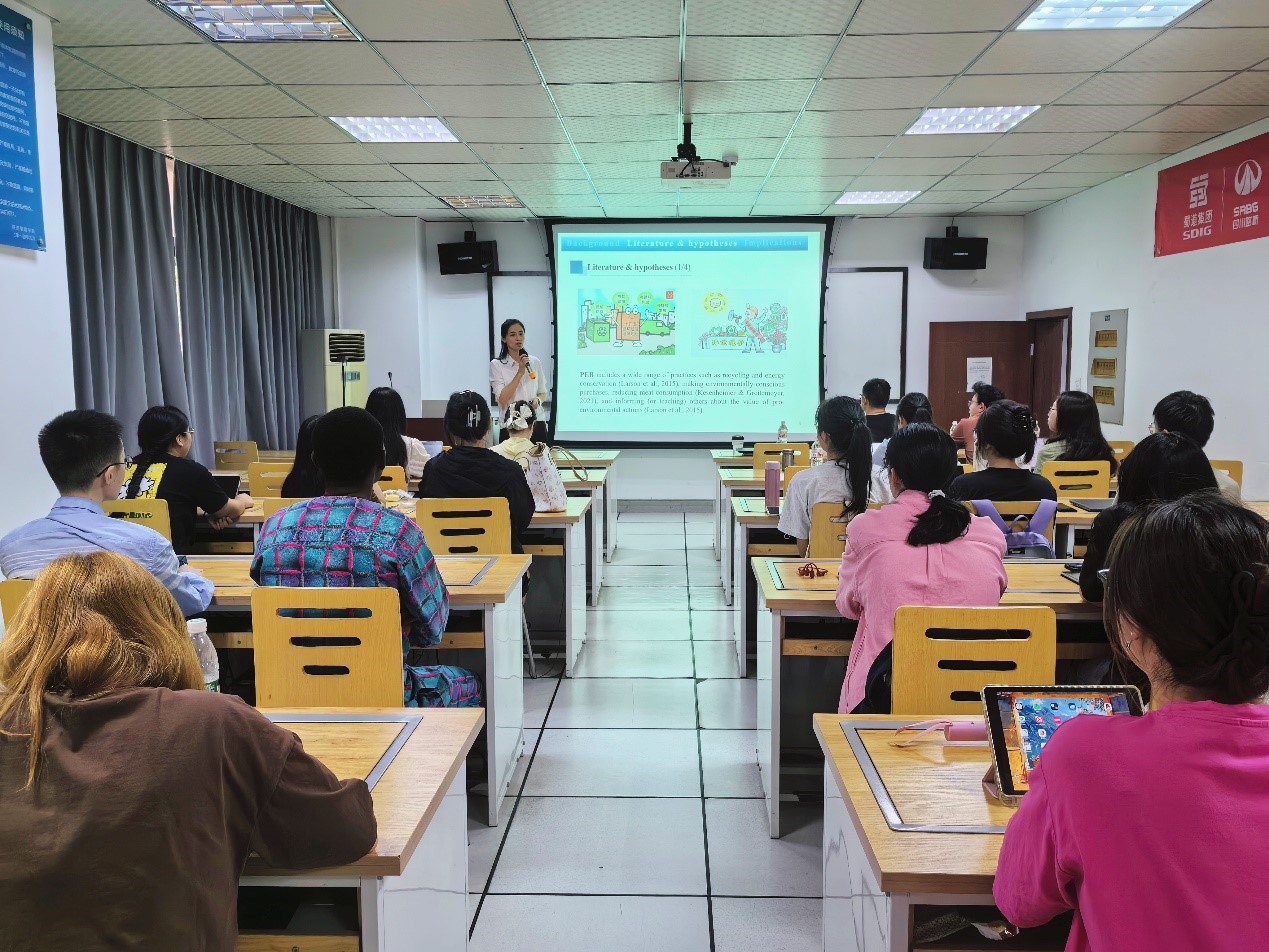 随后,张博士系统概述了当前关于人工智能服务与消费者可持续行为的研究进展。她重点介绍了智能机器人在促进环保行为和抑制不文明行为方面的研究,突出了这一领域的重要性和应用价值。结合相关理论框架,她详细对比了不同干预措施的有效性,并深入介绍了在定量研究分析中采用的情境实验方法,包括实验设计和数据分析的关键环节。这部分内容引发了与会者之间的广泛兴趣,国际学生们尤其对如何在研究中考虑文化差异的问题进行了讨论。