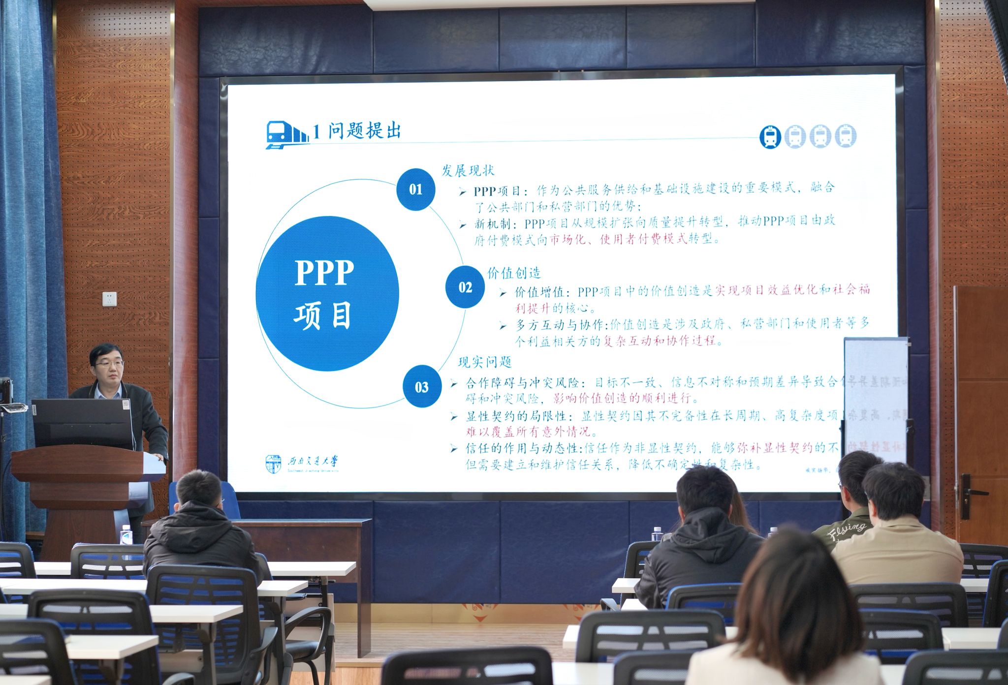 工程管理系系主任刘继才教授,围绕“动态信任下PPP项目价值创造协作机制研究”这一主题展开分享,学院部分师生到场聆听。