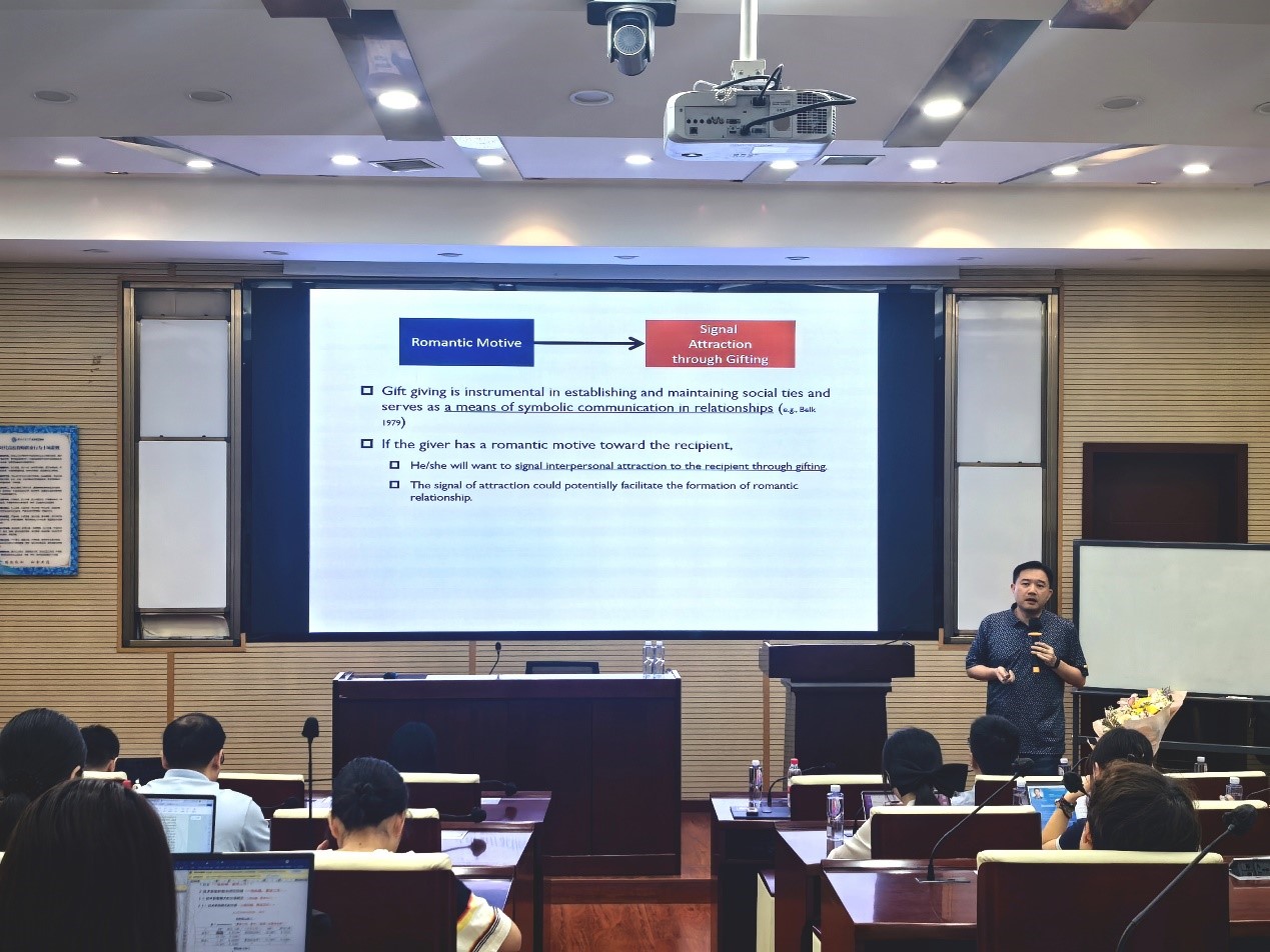本次讲座聚焦于浪漫动机如何影响礼物选择的问题。在讲座伊始,姜教授指出,社会关系对于人类的幸福和福祉至关重要,送礼是建立和维系这些关系的关键行为。送礼的普遍性推动了礼品行业的蓬勃发展,这使得营销和消费者研究人员有必要了解消费者如何选择礼物。