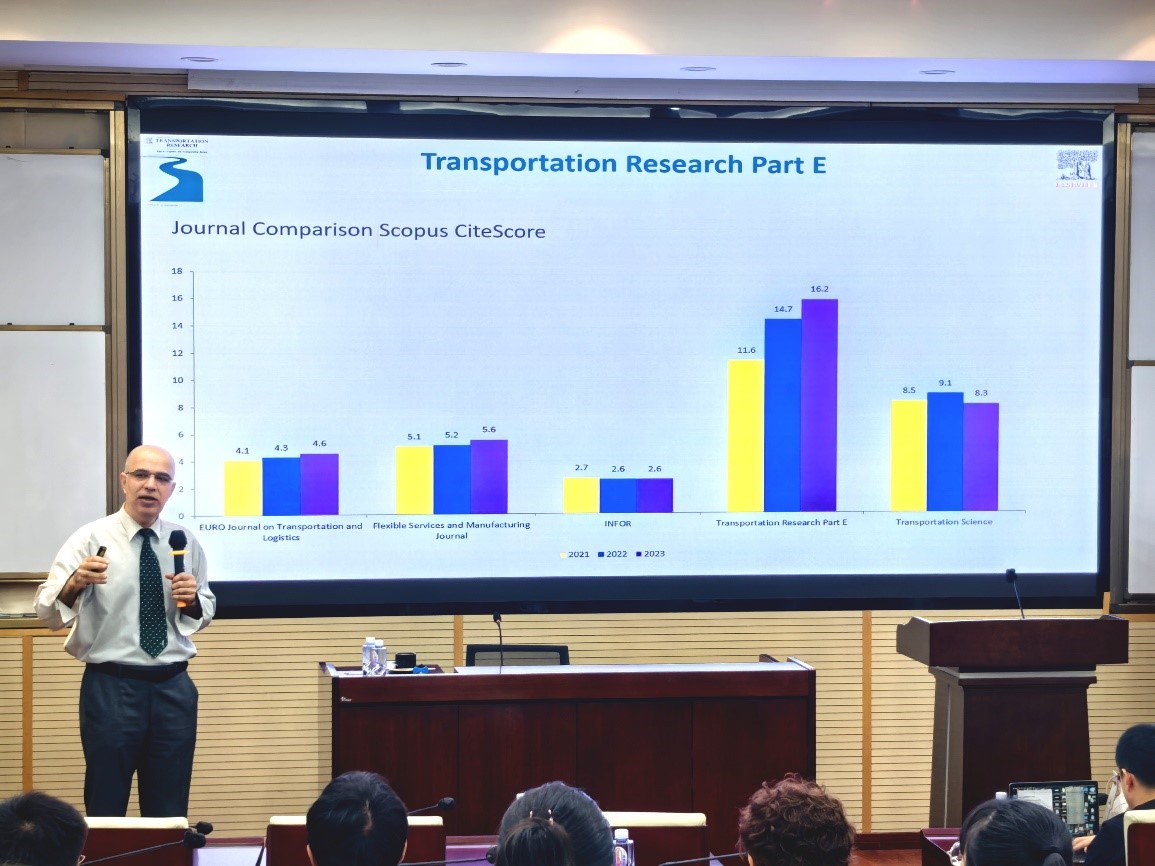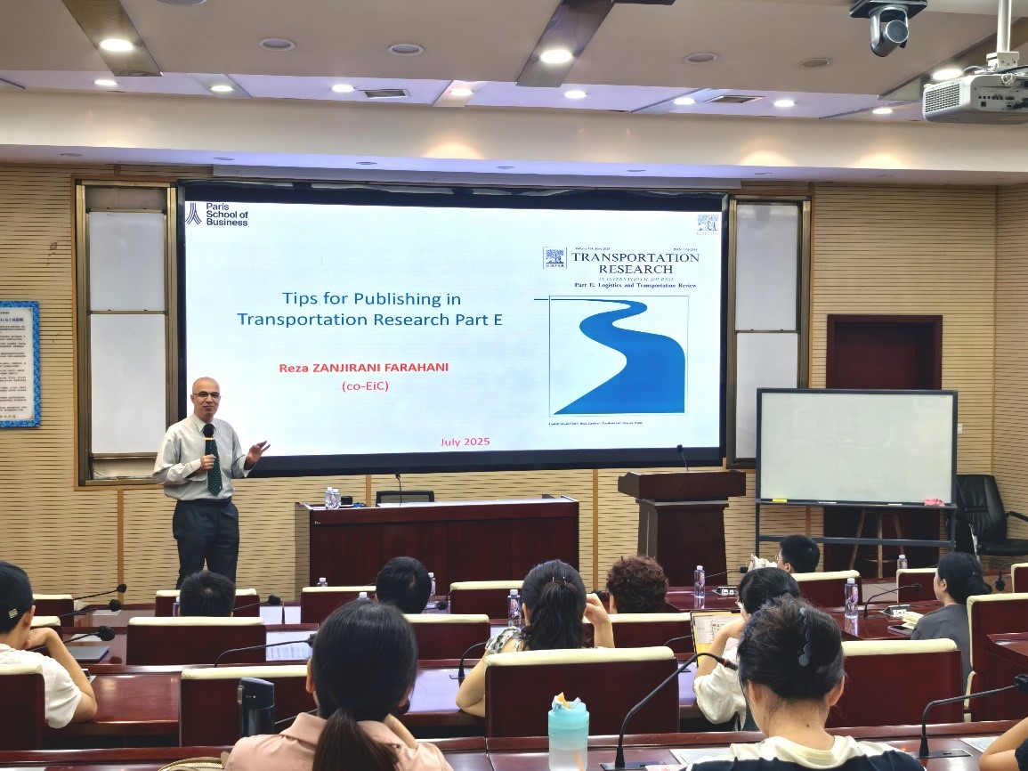 2025年7月4日上午在九里校区零号楼0204室,学院特邀Transportation Research Part E (TR-E)主编、法国巴黎商学院Reza Zanjirani Farahani教授做题为“Publishing in Top-Tier Journals: From General Principles to Transportation Research Part E (TR-E)”的学术讲座。讲座由17吃瓜